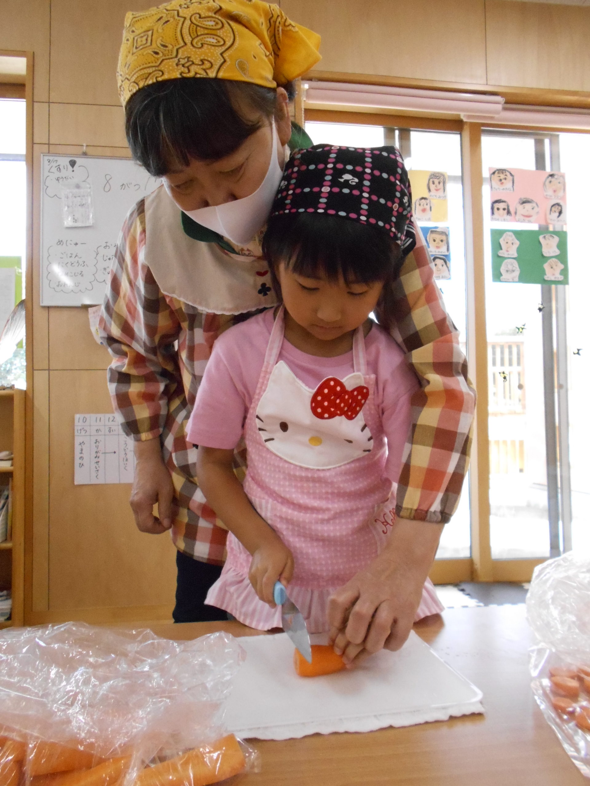 ひまわり組(5歳児)は、にんじん・じゃがいもを包丁で切りました。