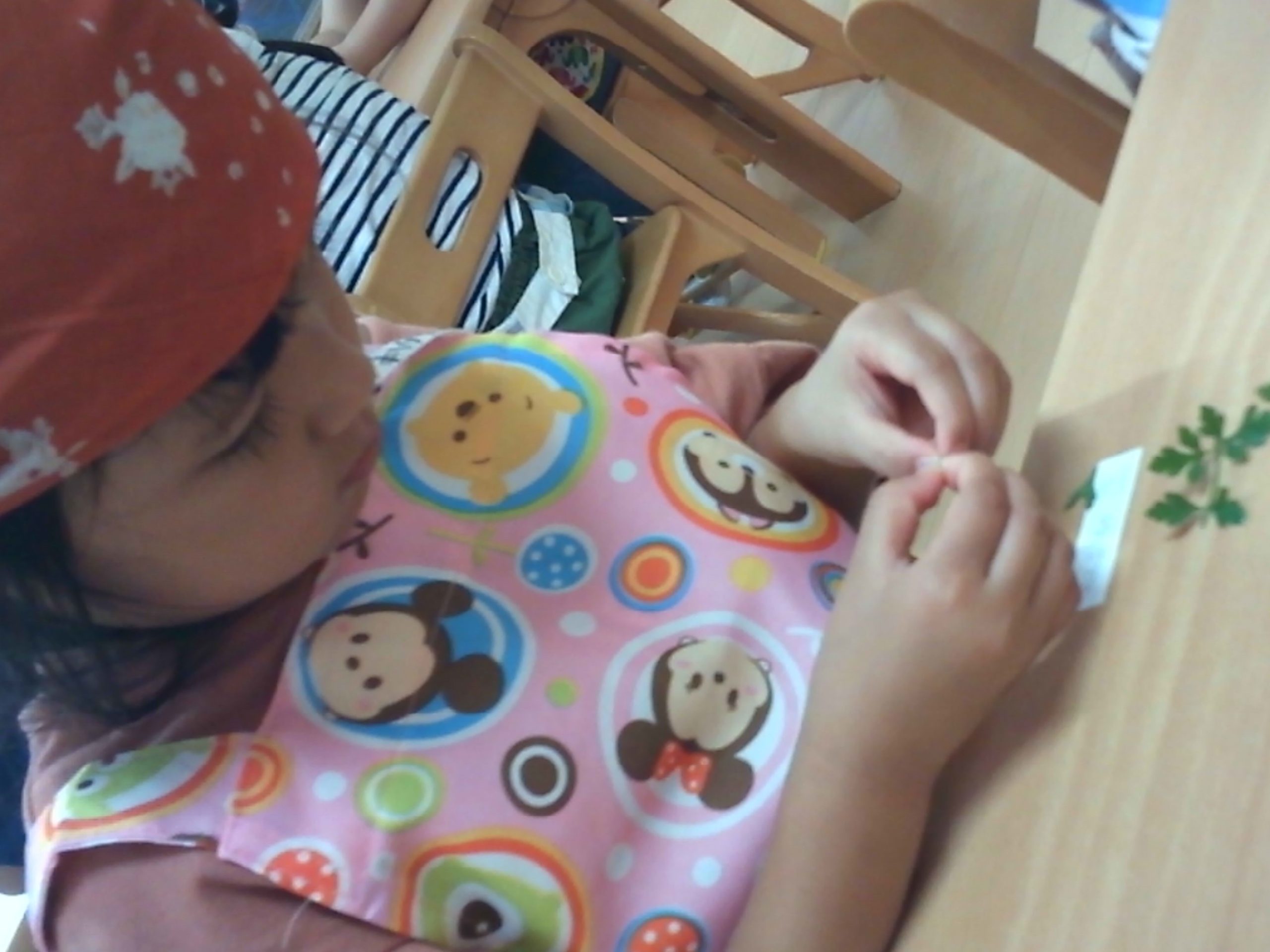 ばら組(3歳児)はミニトマトをつぶして、つぶれいく感触を楽しみ、