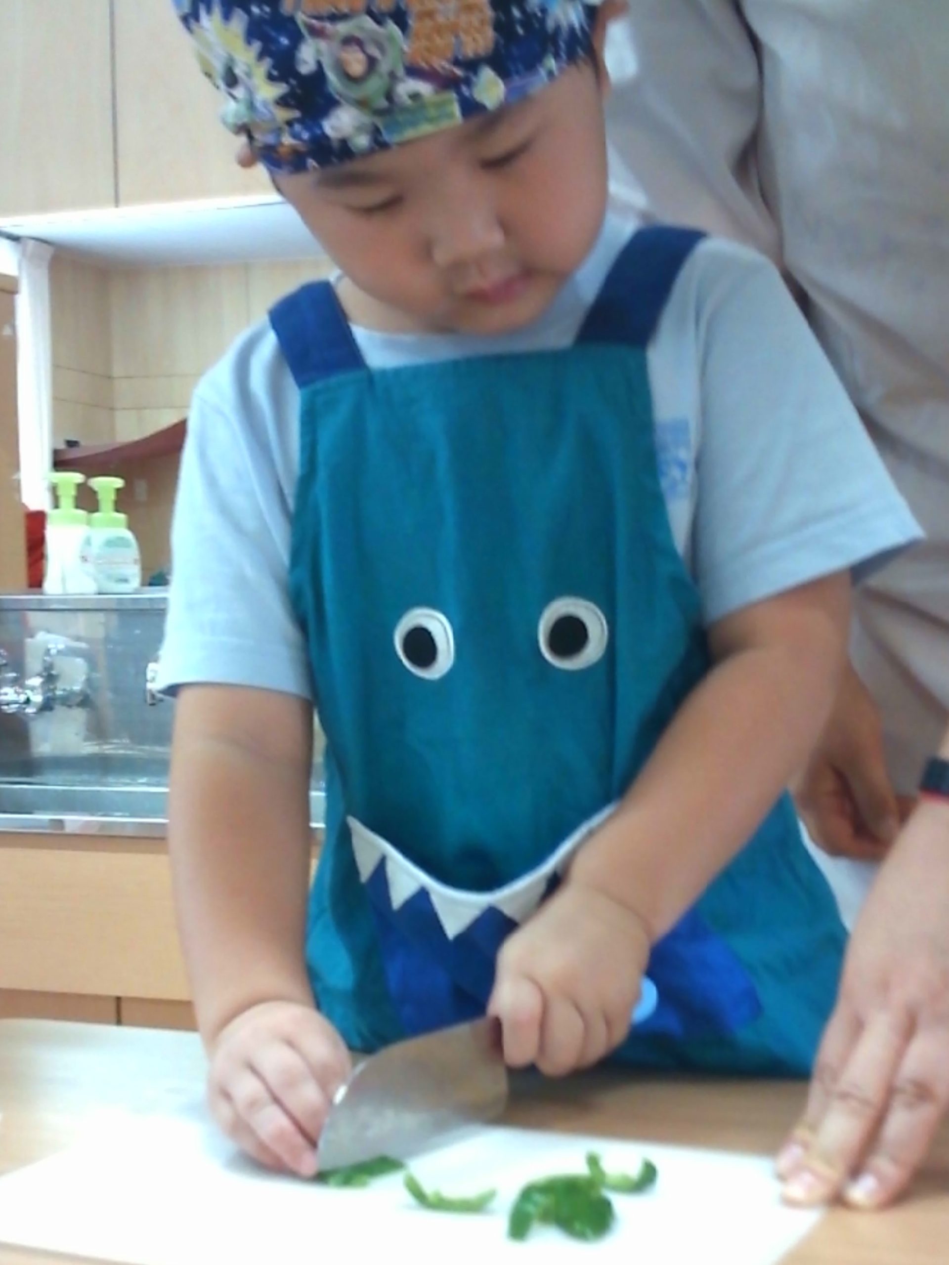 ゆり組(4歳児)はピーマンを包丁を使って切りました。