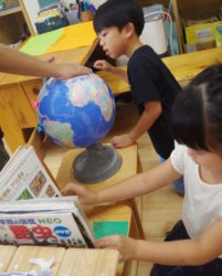虫たちを調べるために、図鑑に付箋が付いていたり、地球儀には生息地も印付けられ、