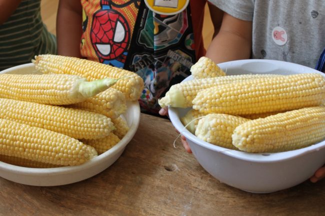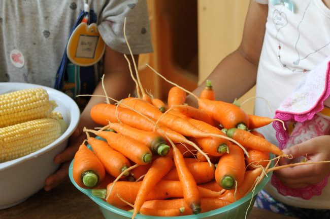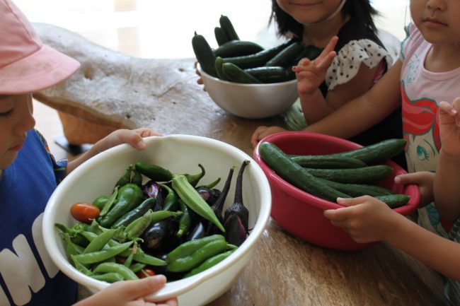 今年の夏は天候不順で野菜の生育にも影響が出ています。そんな中パリスの畑では、今日もたくさんの野菜 が収穫できました。取り立て野菜はみずみずしく、嫌いな野菜にも箸が伸びます。みんなできれいに洗った 後は厨房へ。明日のランチが楽しみです。