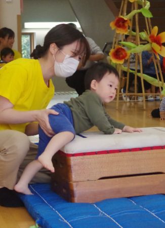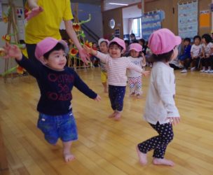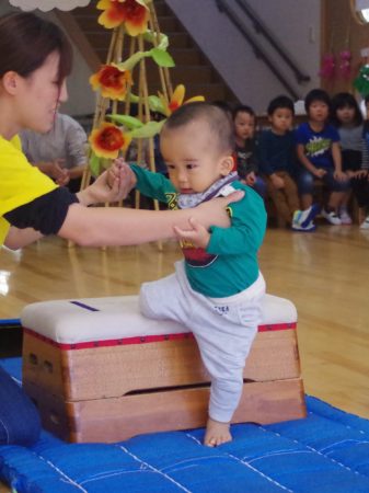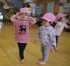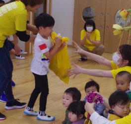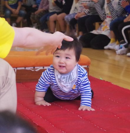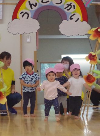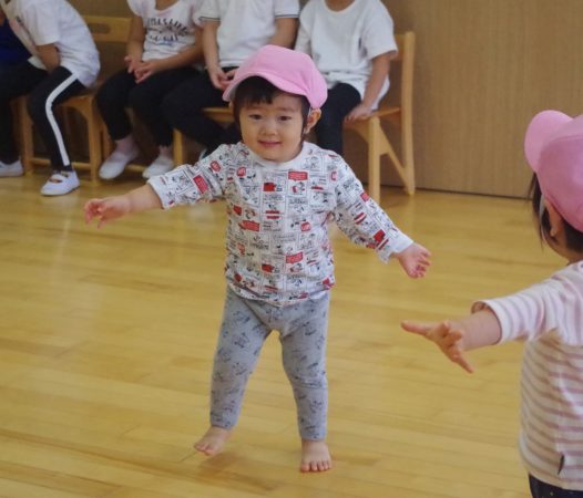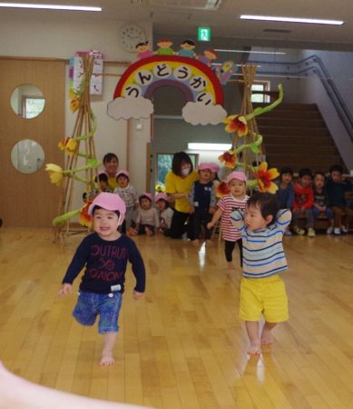 今日は、ゆめ組(0歳児)と にじ組(1歳児)の為に、みんなで運動会ごっこを行いました!
