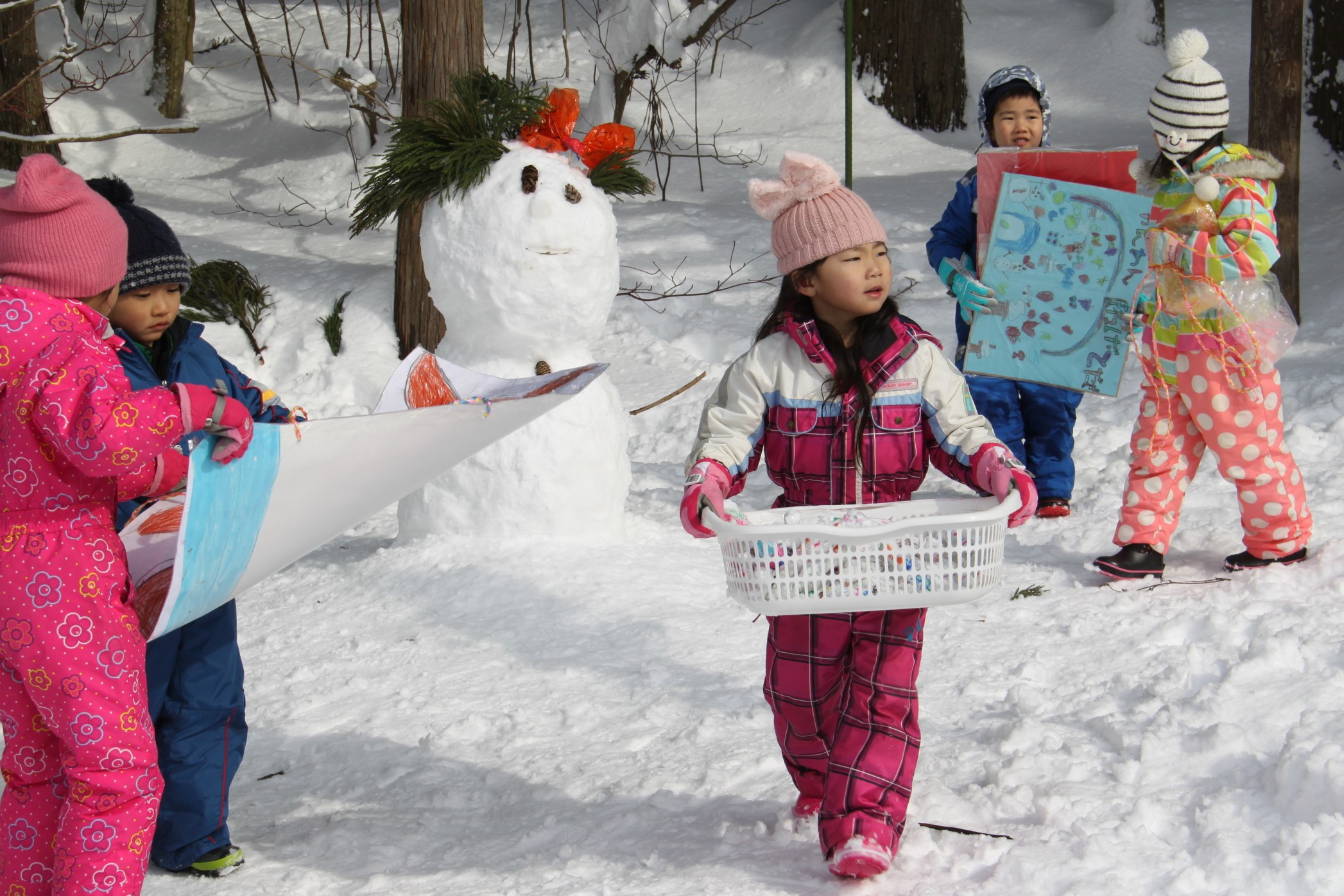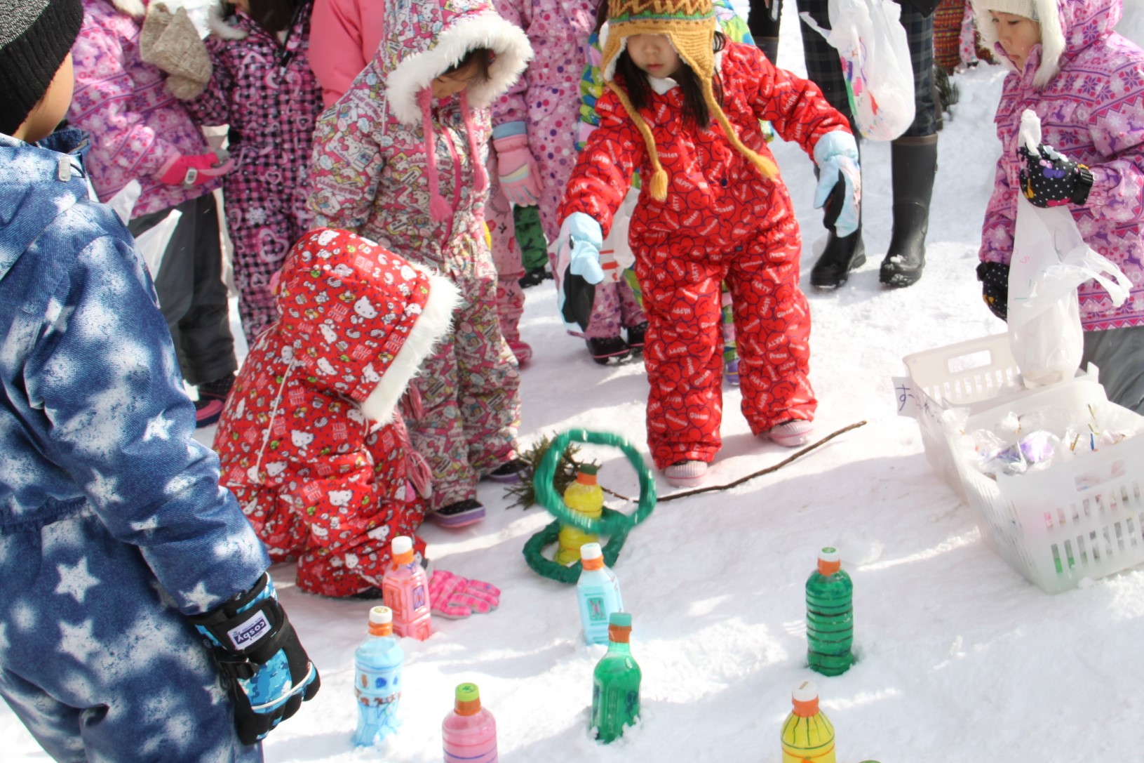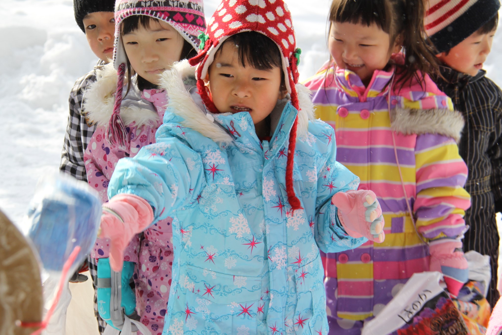寒い毎日ですが、今日は天候にも恵まれ「たいよう きらきらゆきまつり」が行われました。年長組が今まで準備をして、年中と年少組の子ども達を招待しました。