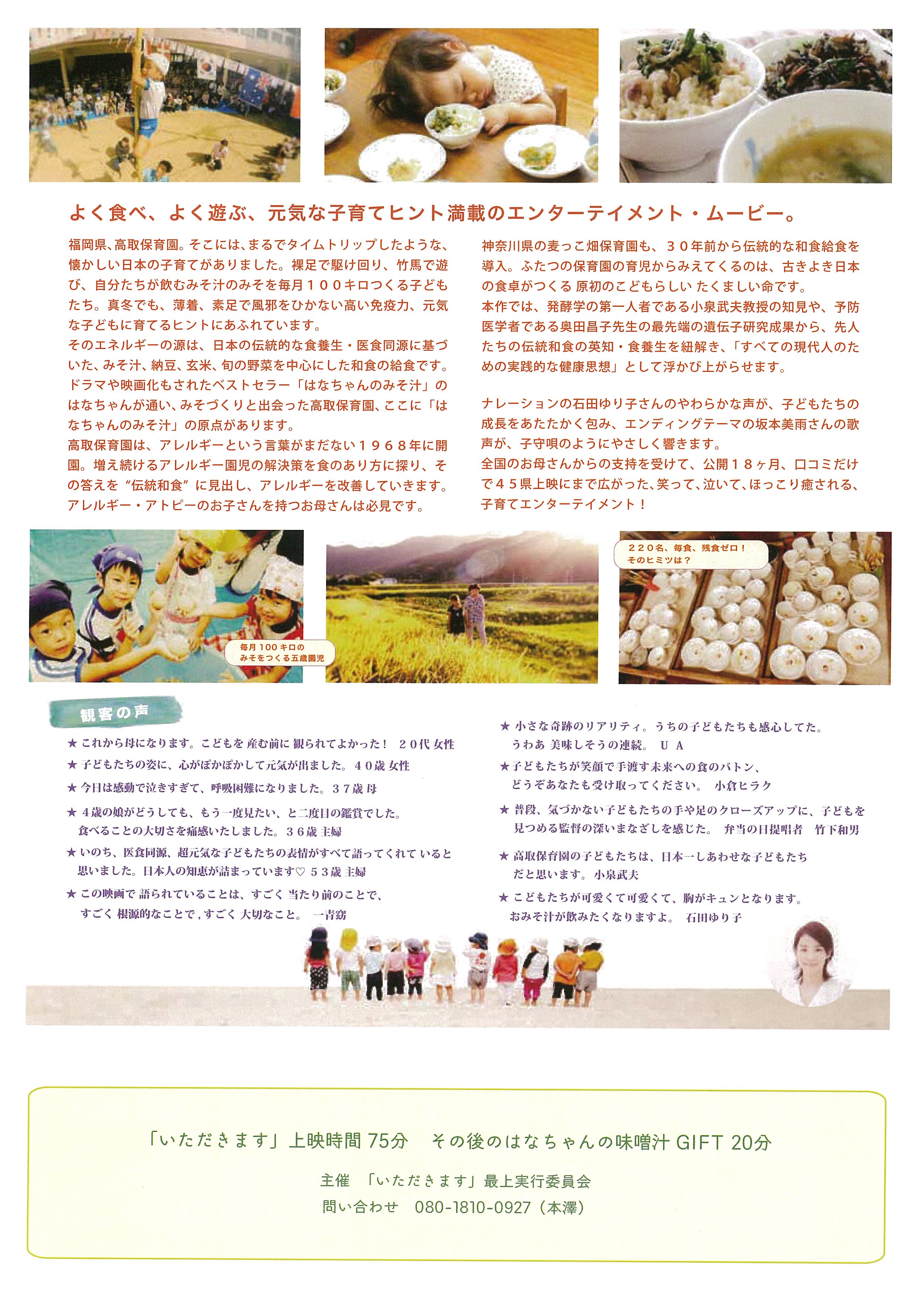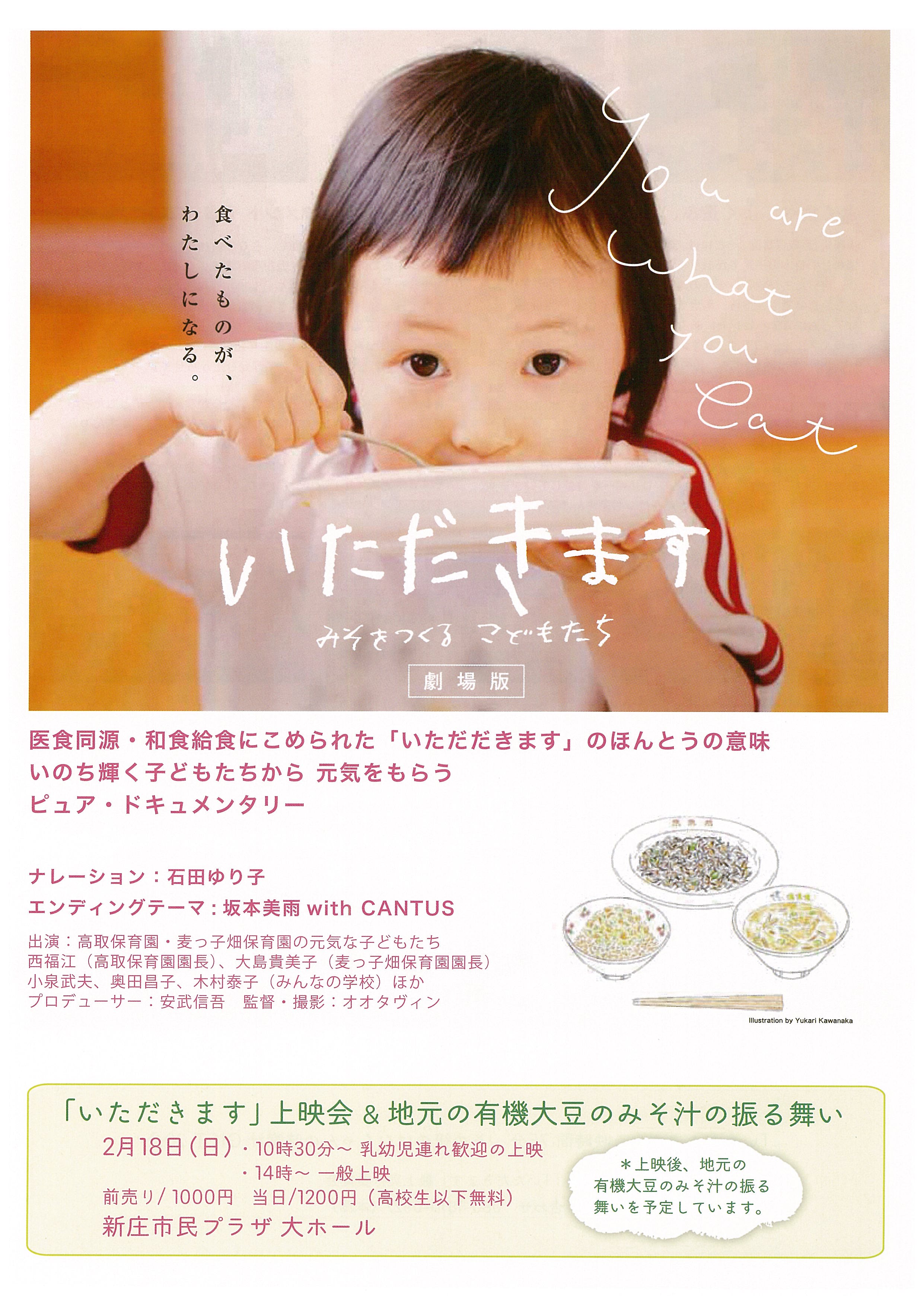 「 いただきます ~みそをつくるこどもたち~ 」 よく食べ、よく遊ぶ、元気な子育てヒント満載のエンターテイメント・ムービー 2月18日(日)10時30分~・14時~ 新庄市民プラザ大ホールで上映! お近くの方は是非どうぞ !!