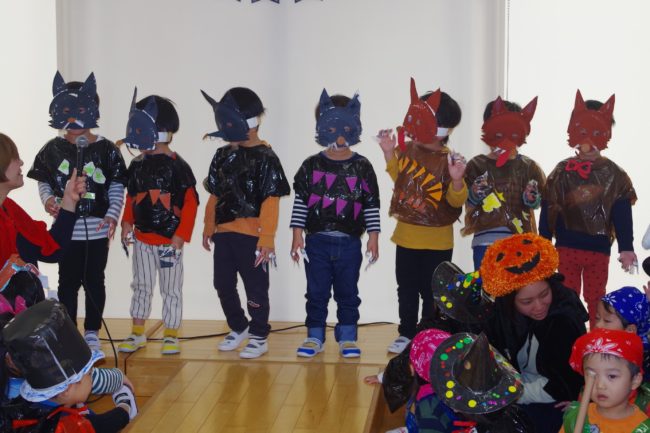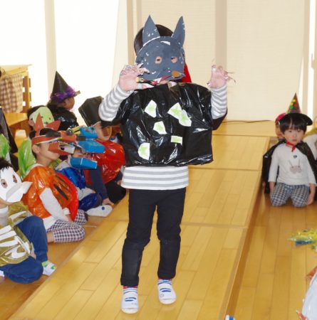 最初はペープサートで「ハロウィン」の由来を伝えて、手作り衣装でパーティーのスタート!