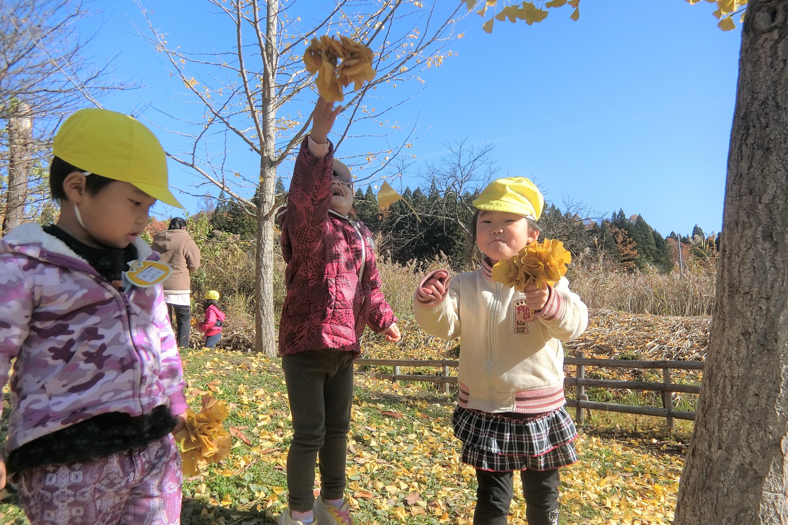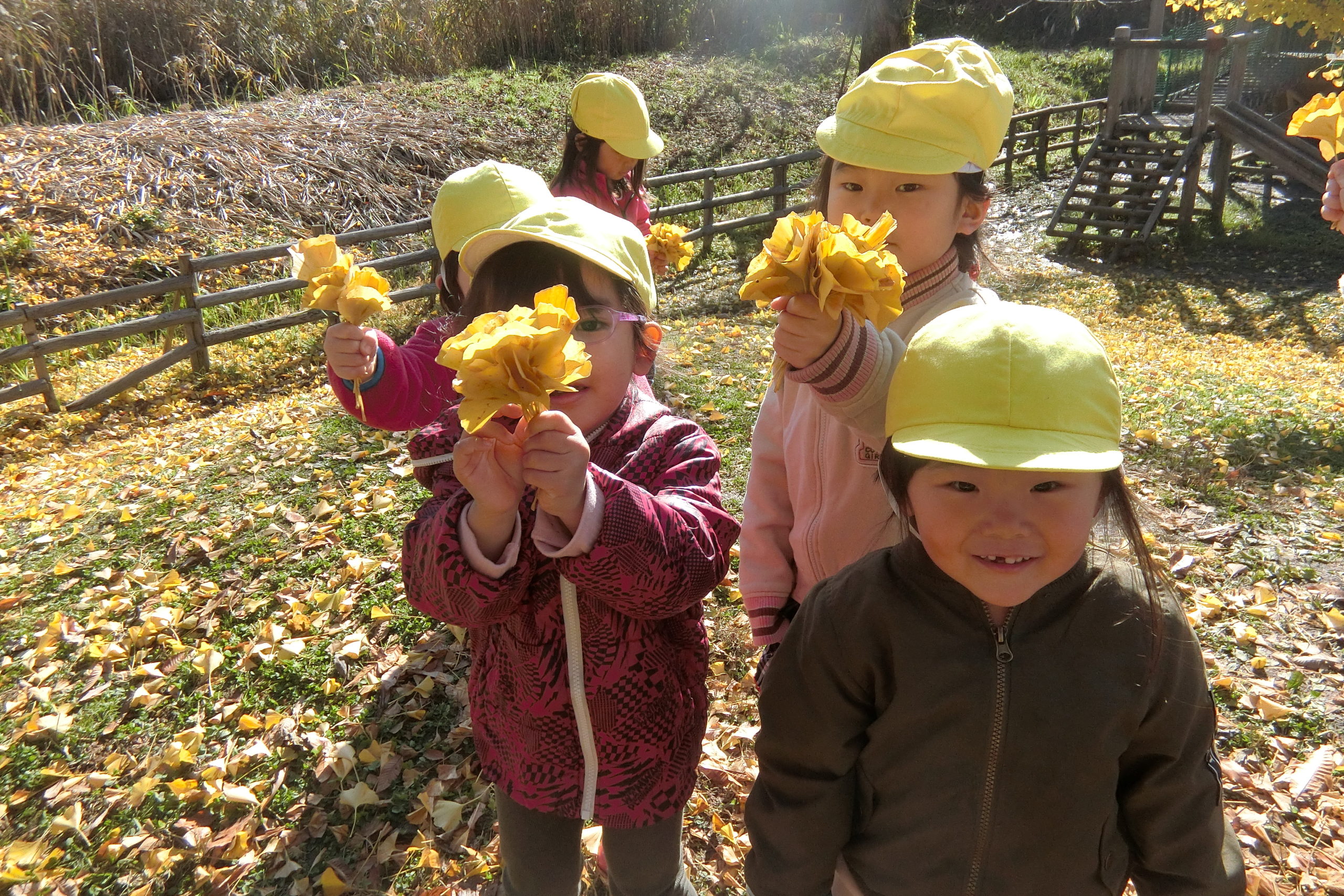 イチョウのじゅうたんの上では、はっぱを1枚ずつ拾って花束の完成~!