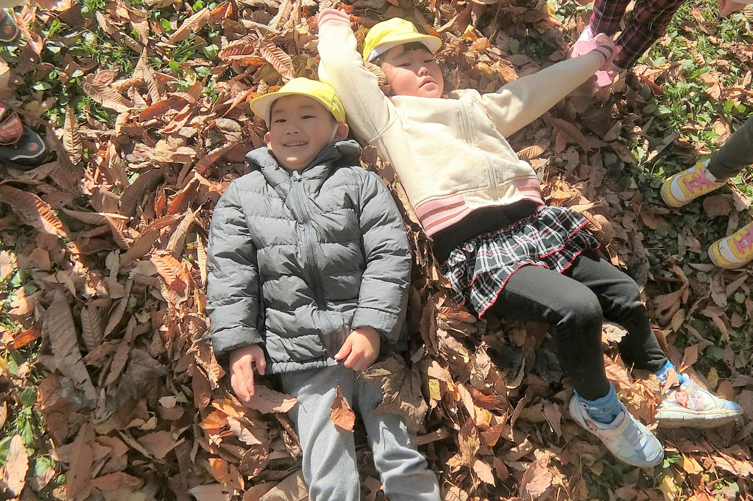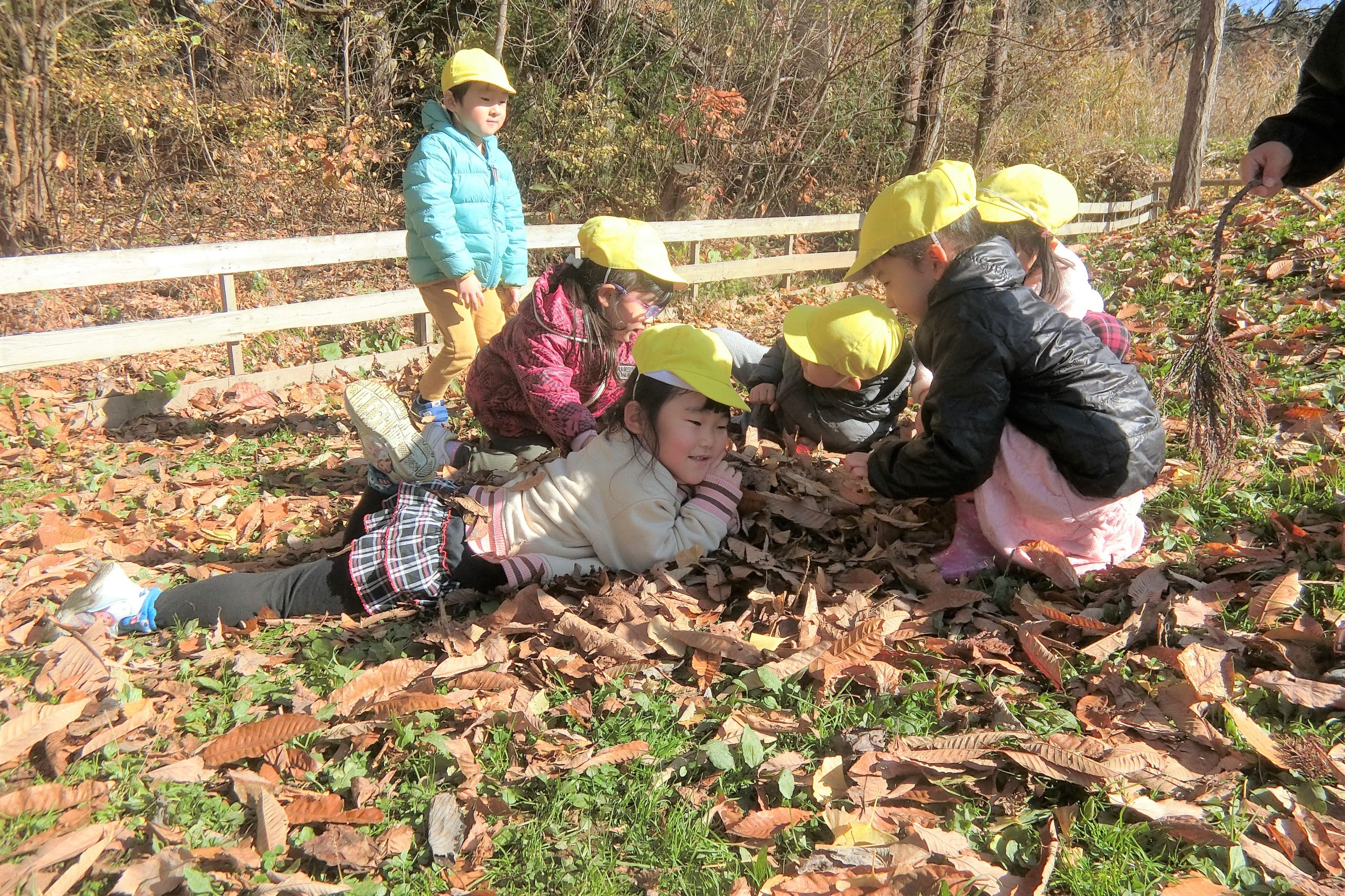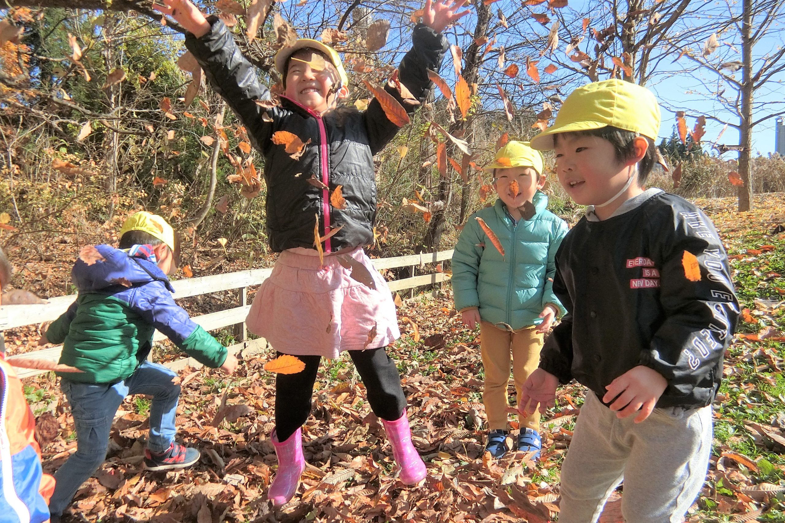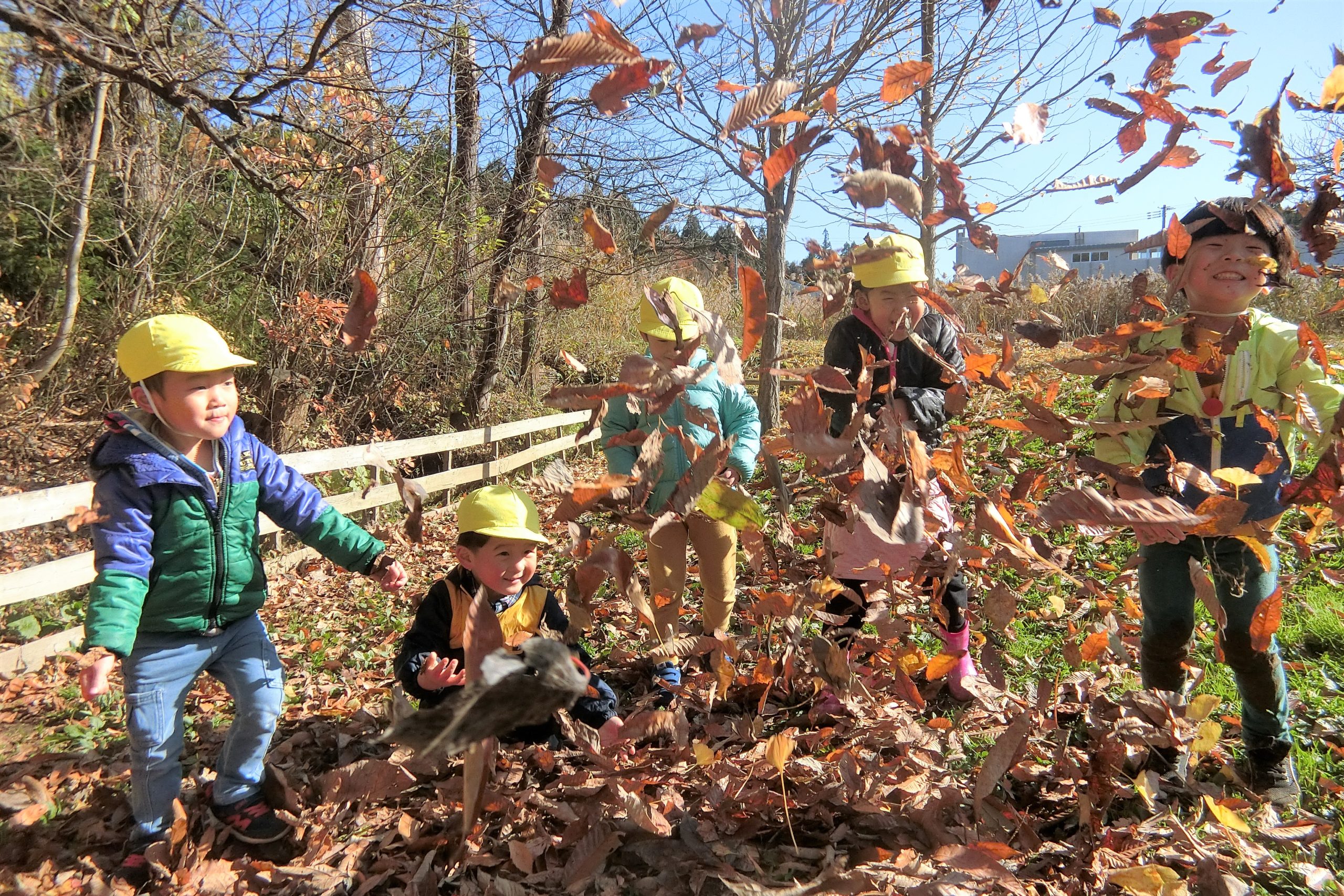 全身使って、はっぱで遊ぶ子ども達。