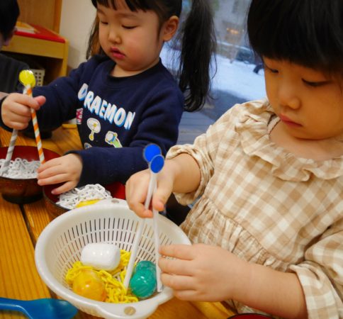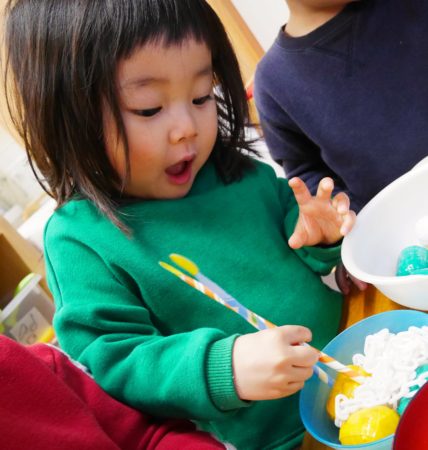 そのために、おままごとコーナーで「クルクル棒(紙を筒状に丸めた物)」を使って…、