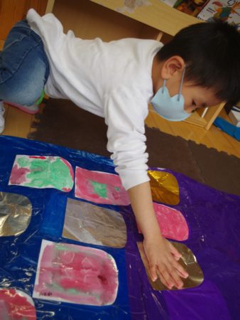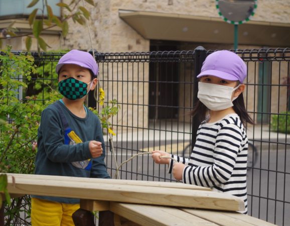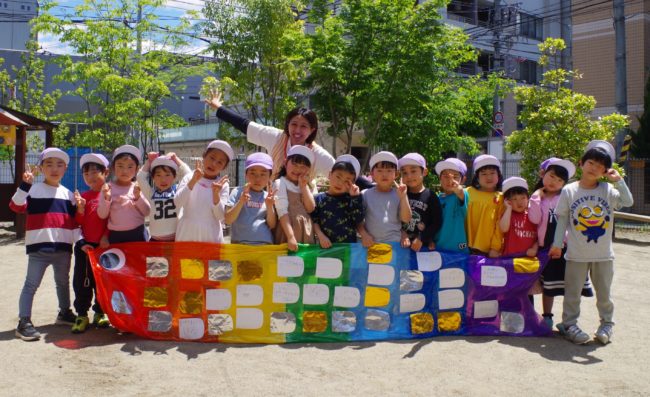 他のクラスの子達も、たいよう組の作った大きな にじのぼりを見に来ていましたよ~。