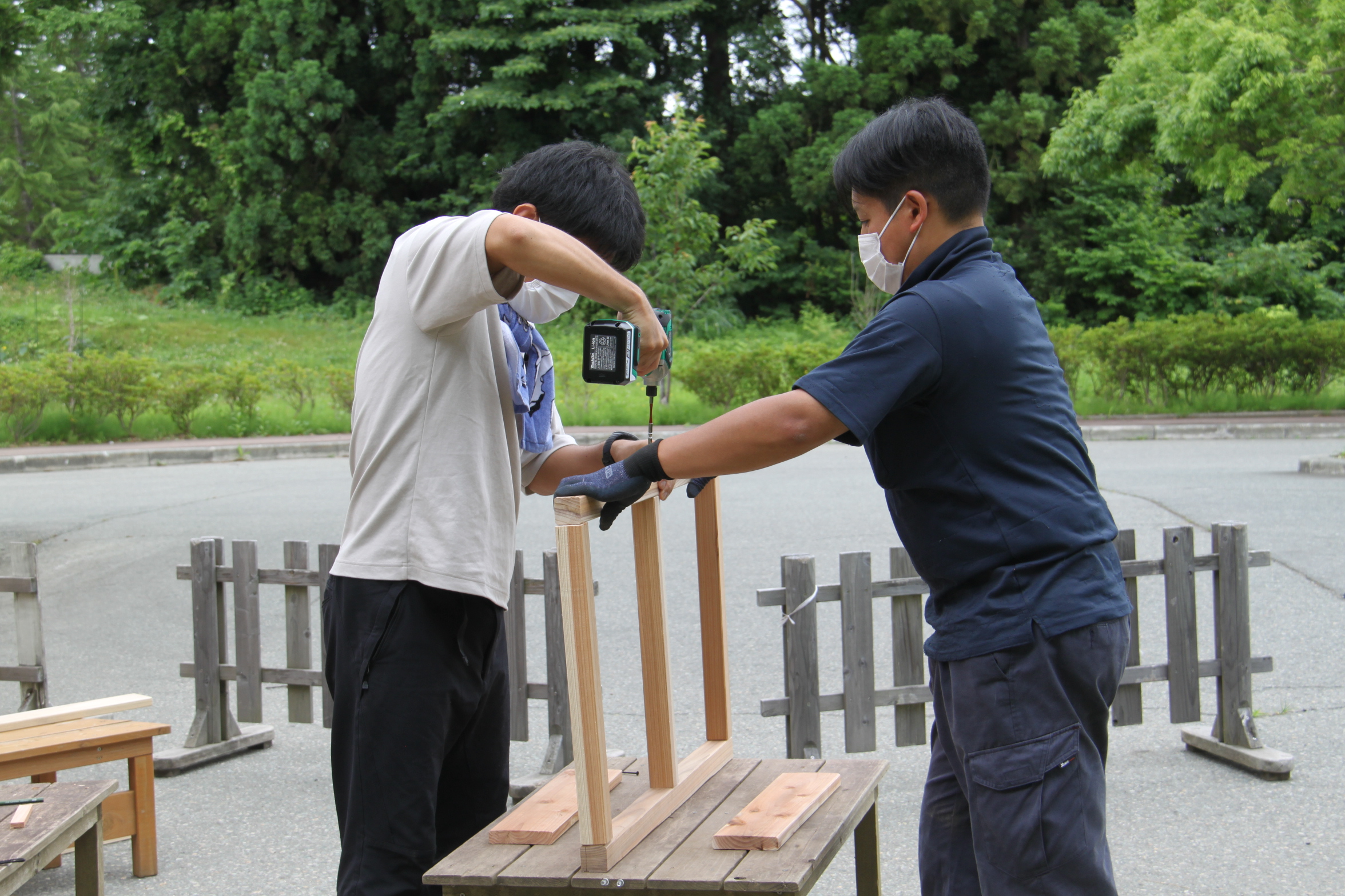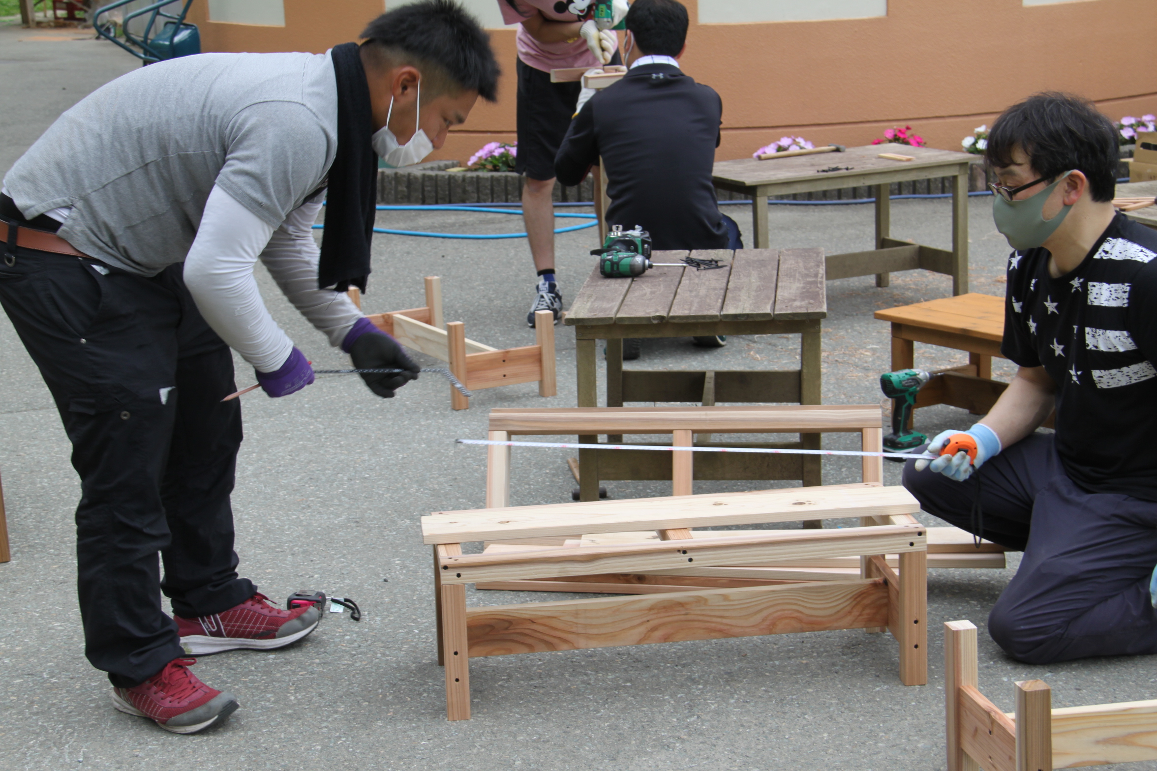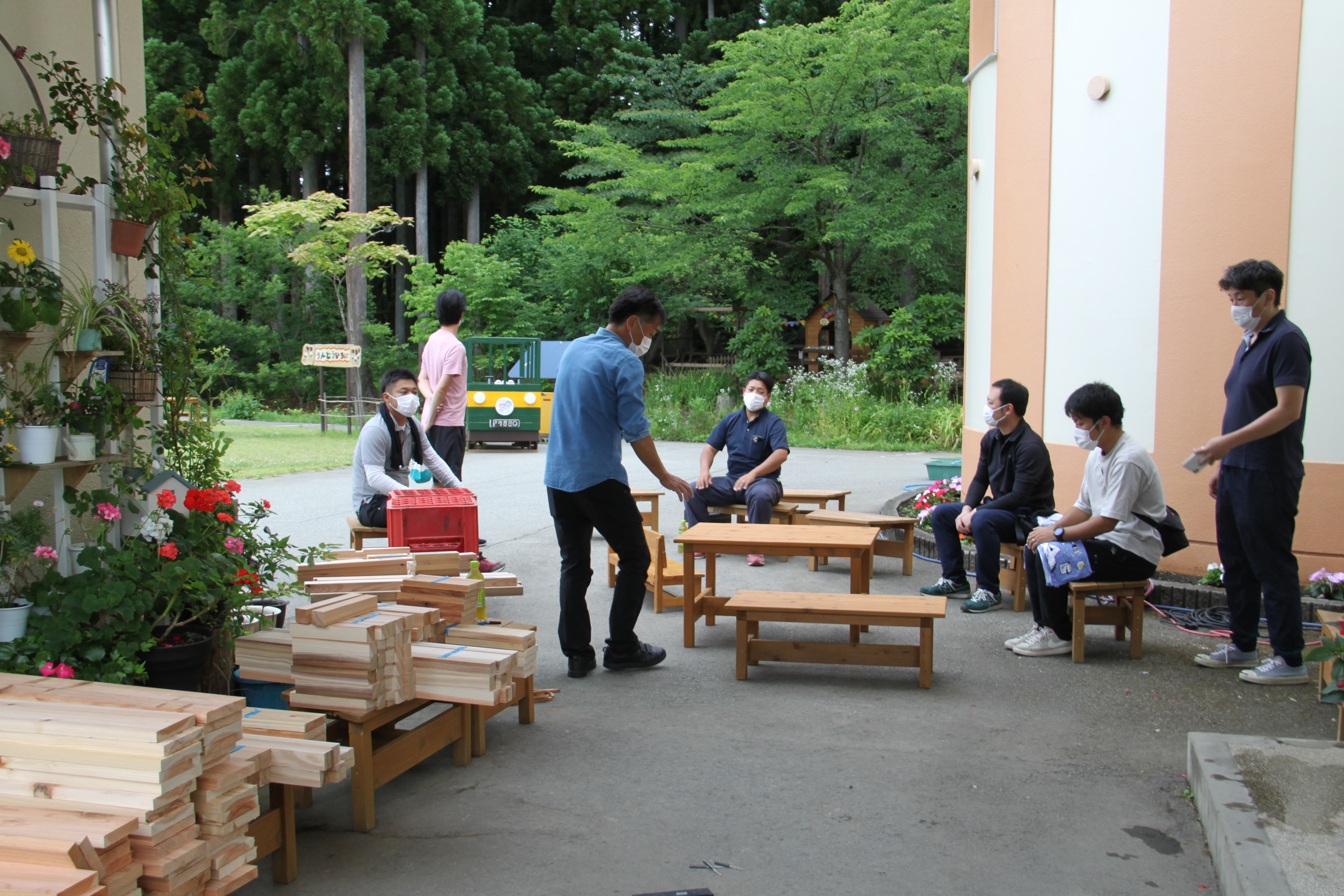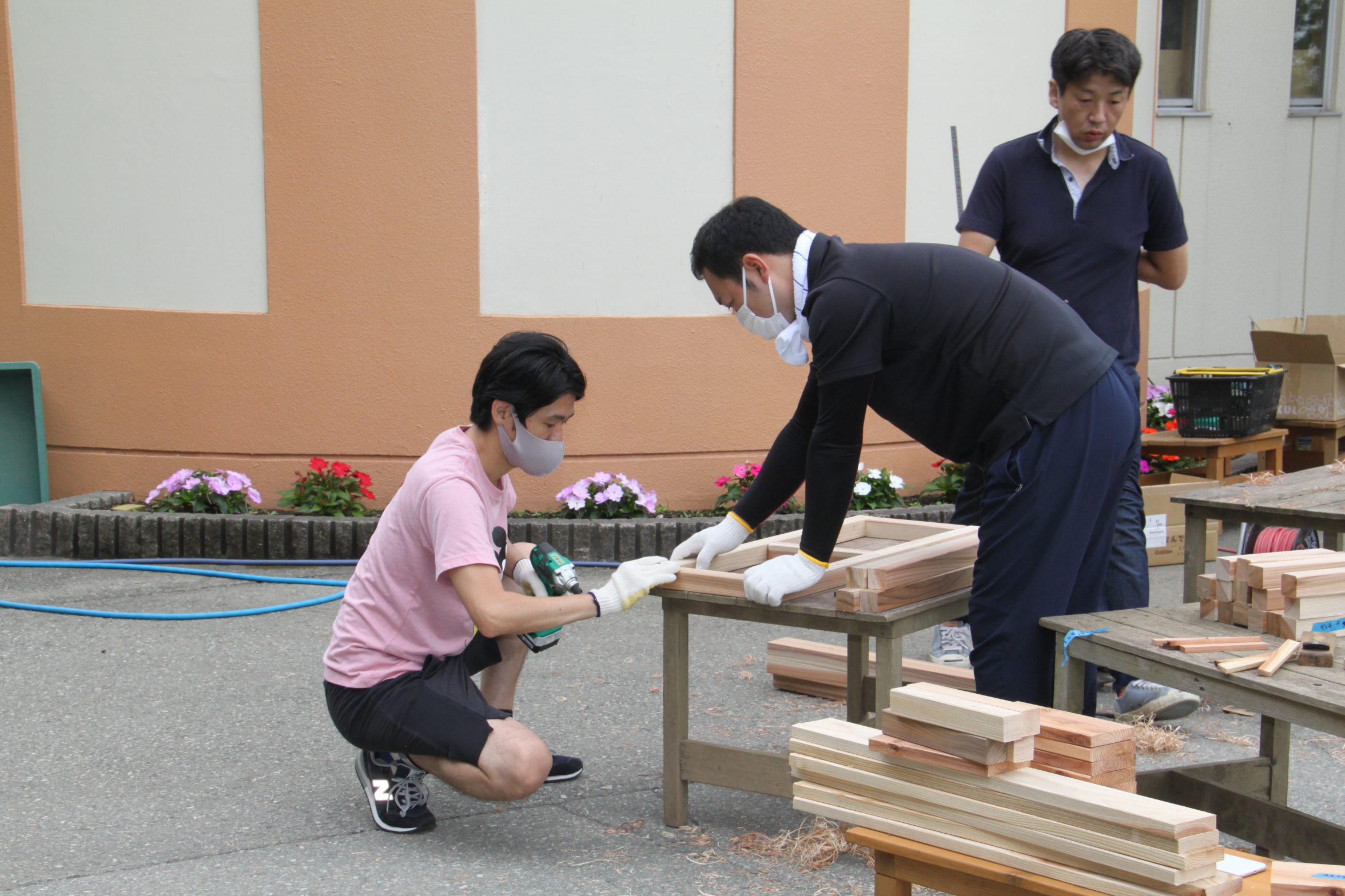 園舎の前にはDIYが得意なお父さん、興味のあるおあ父さんが続々と集結!