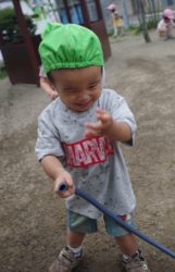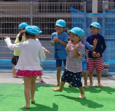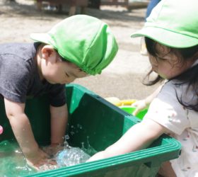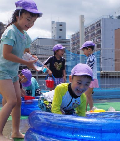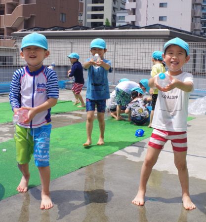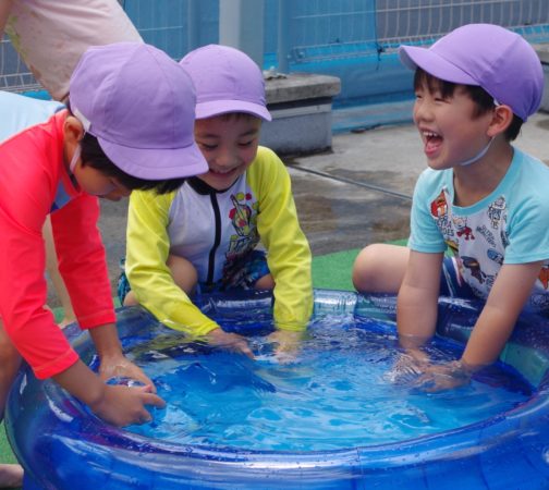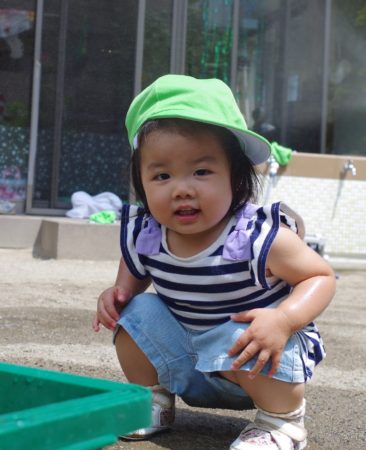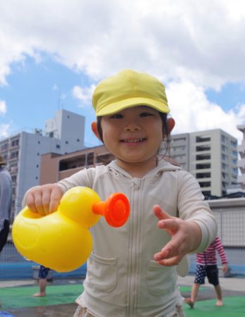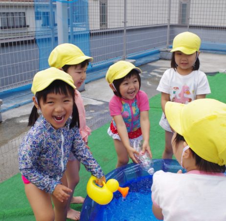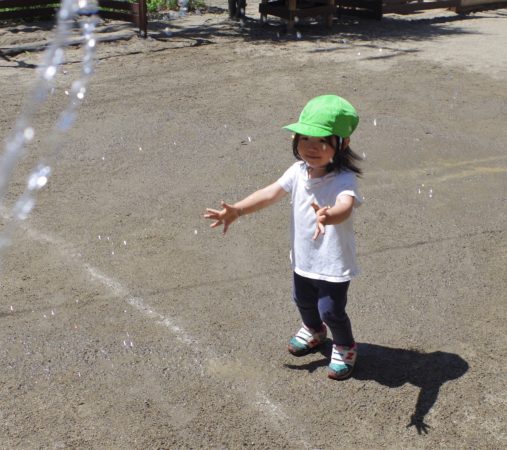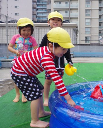 小さなクラスの子達は、園庭でお水遊びを楽しんでいます。