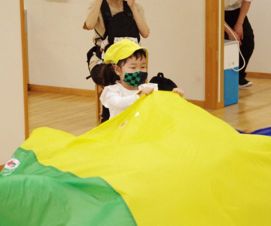 お父さんやお母さんが見守る中、嬉しくてニッコリ。