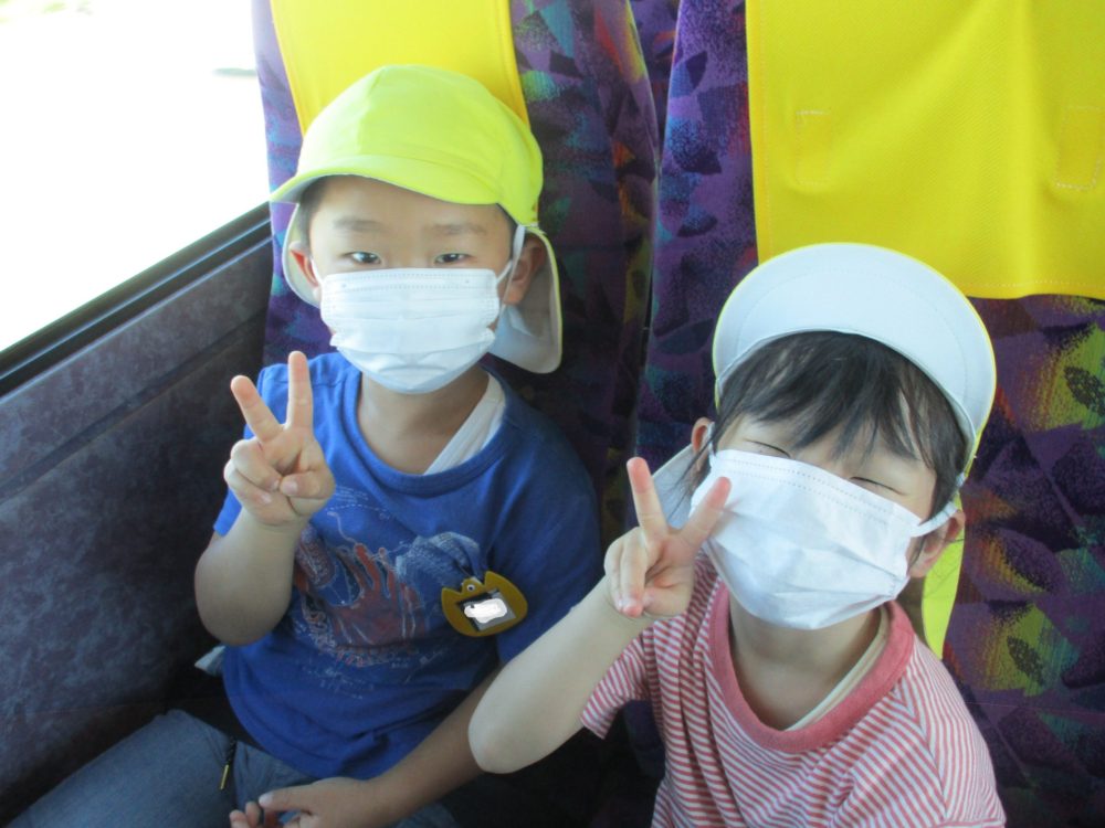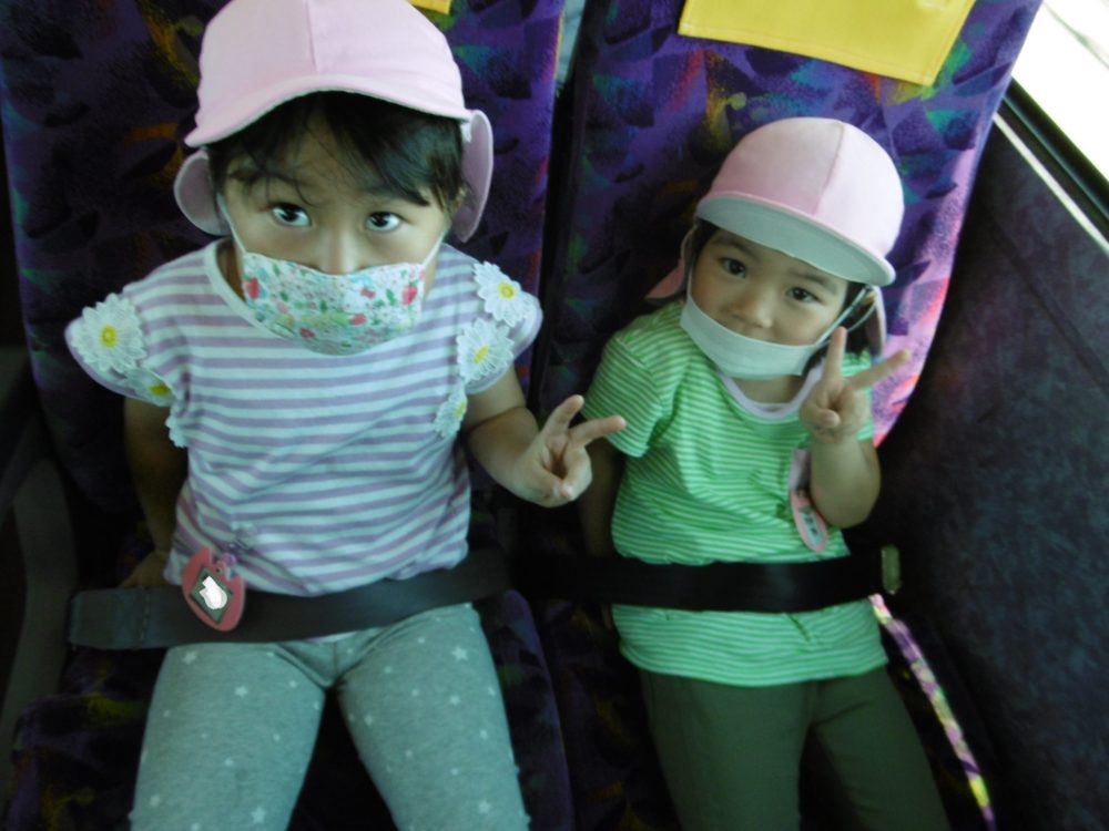 バスに乗ってルンルン気分でピースポーズ!