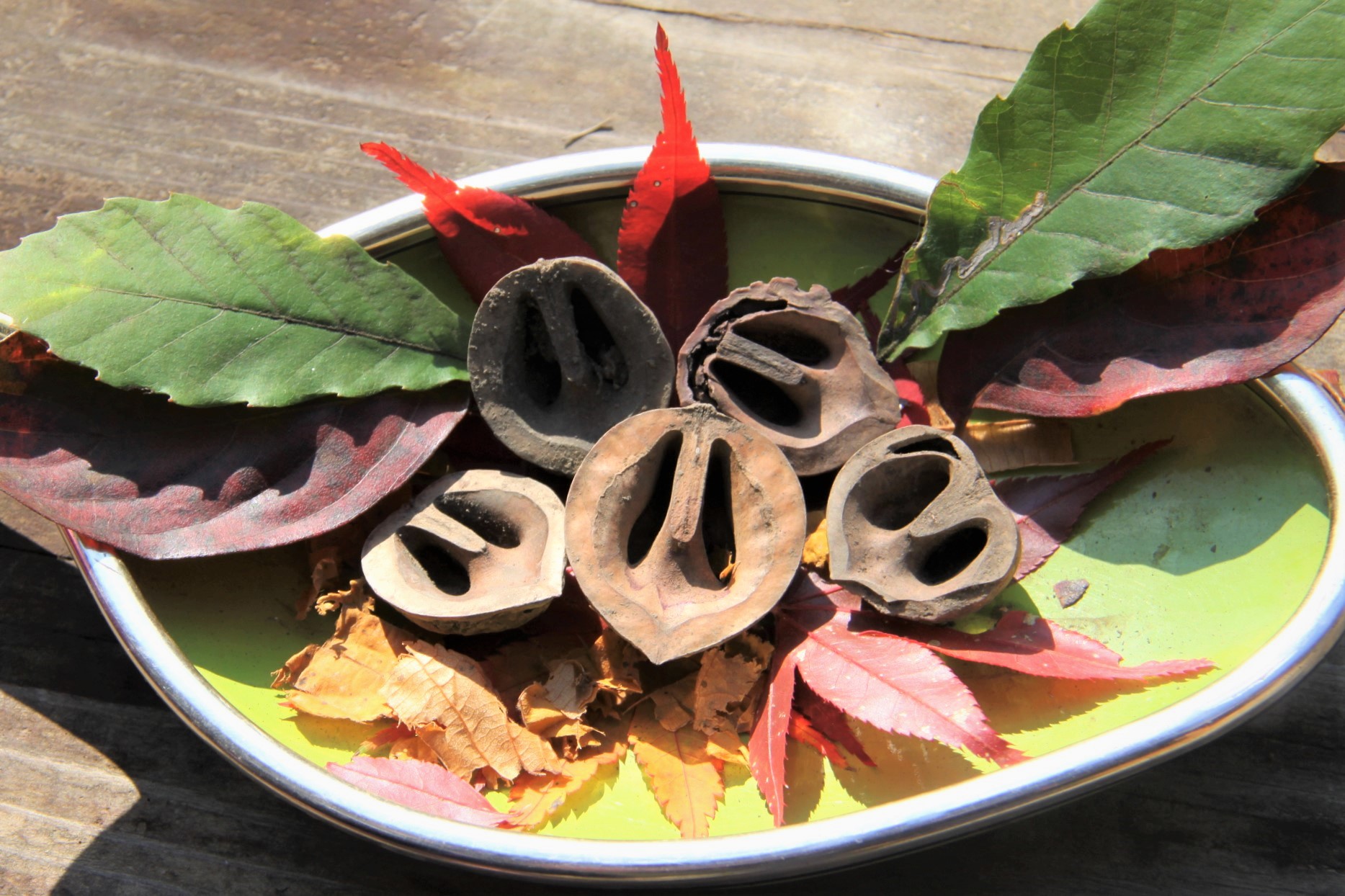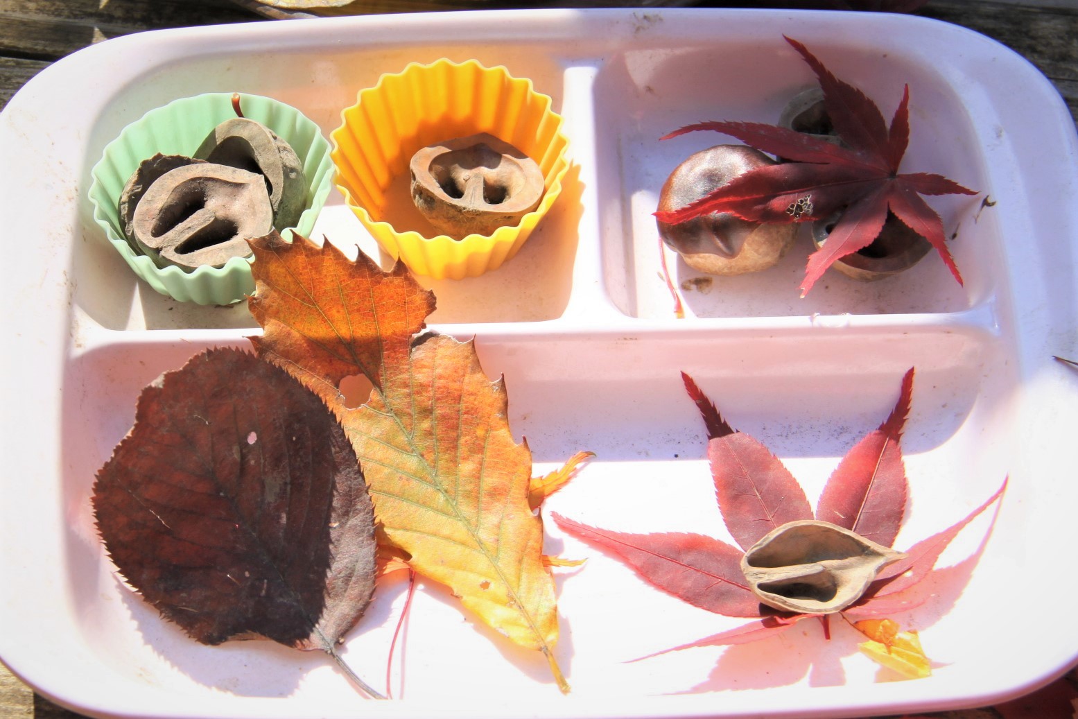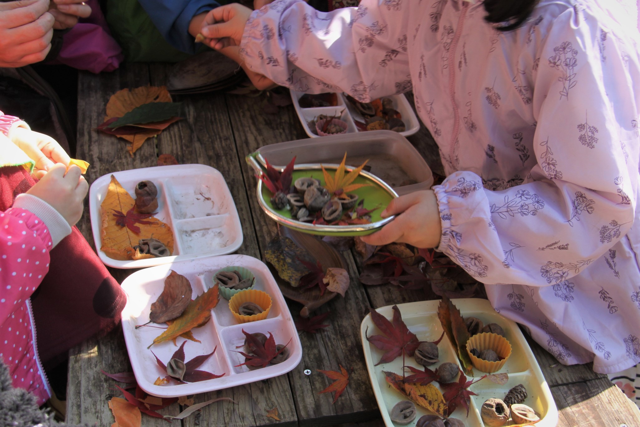 そんな中でいつものごちそうづくり。 材料はリスが食べた木の実やきれいな葉っぱ。
