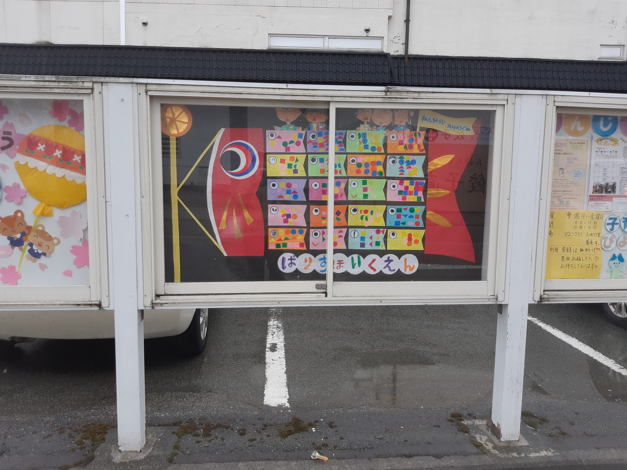 ということで、今回の街角アートは年長児合作のこいのぼり! 一人ひとり作ったミニこいのぼりが集まって、大きなこいのぼりになりました。