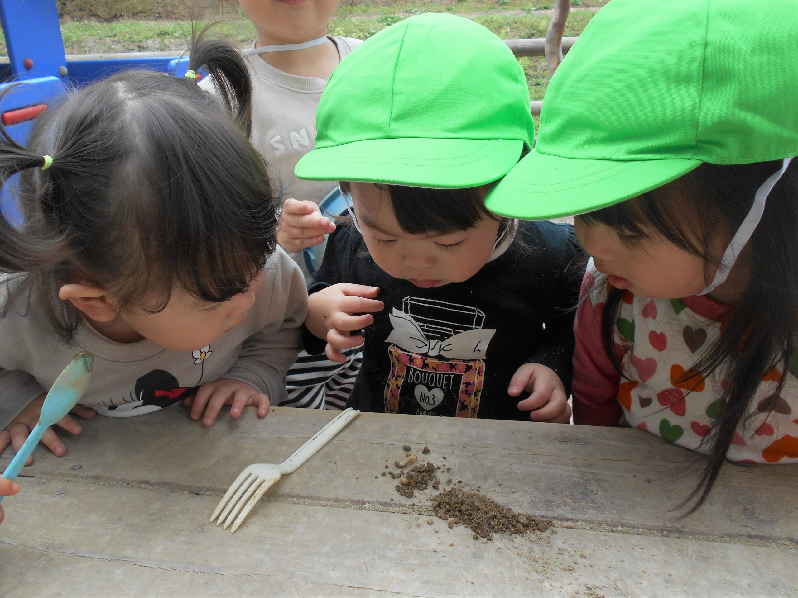 幼虫が出てきてみんなびっくり! でも興味津々!!