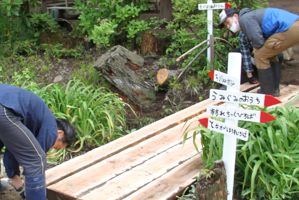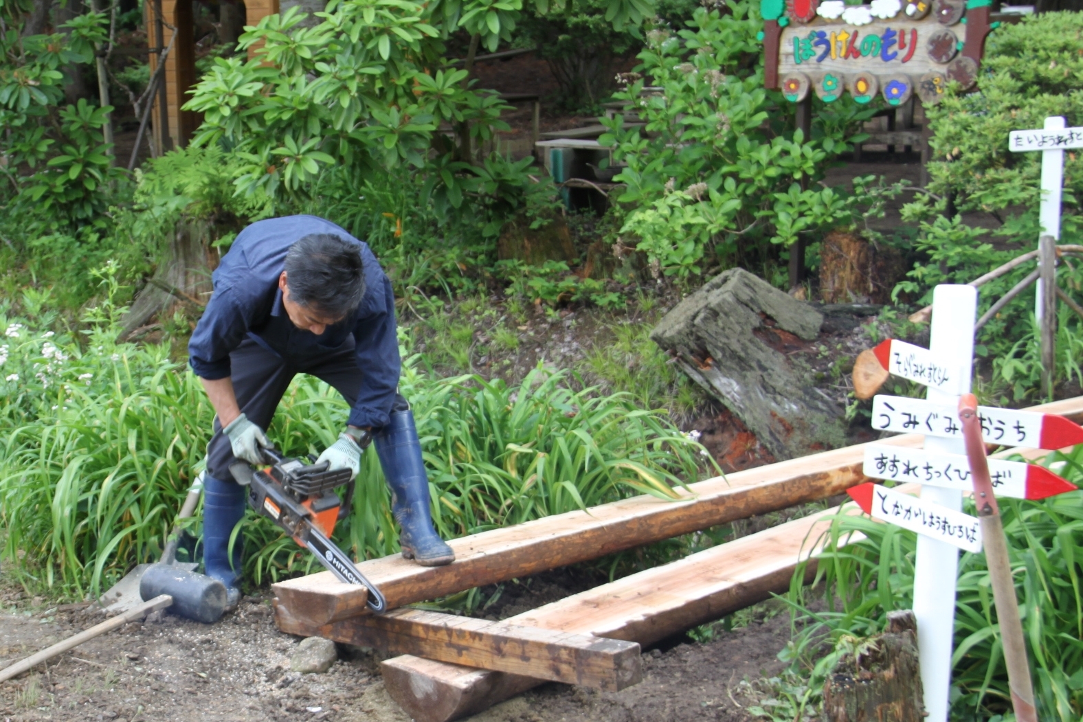 土曜日に冒険の森に渡るための橋のかけ替え作業を行いました。
