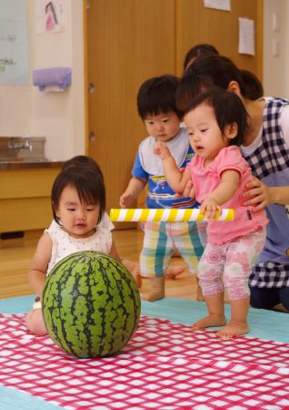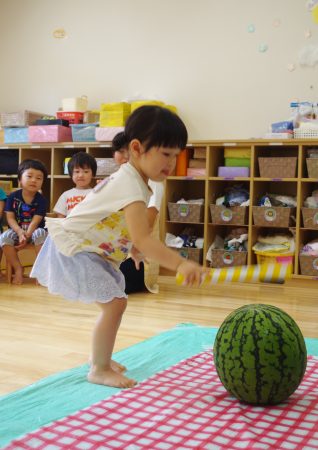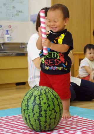 未満児さんも、以上児さんも大好きなスイカが食べれるとあって力いっぱい叩きます!