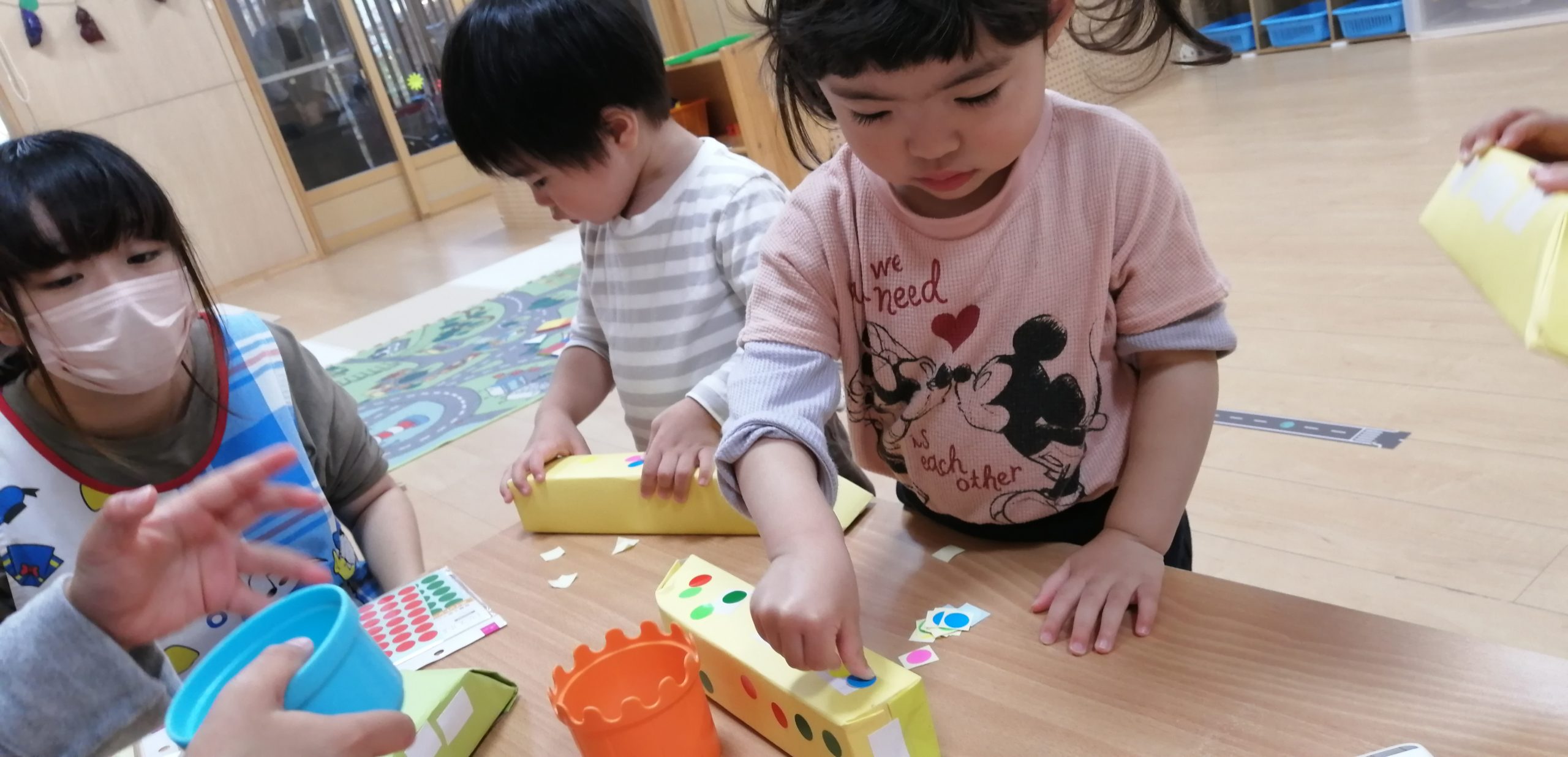 白や赤、黄色の箱に次々と丸シールを貼っていく子どもたち。