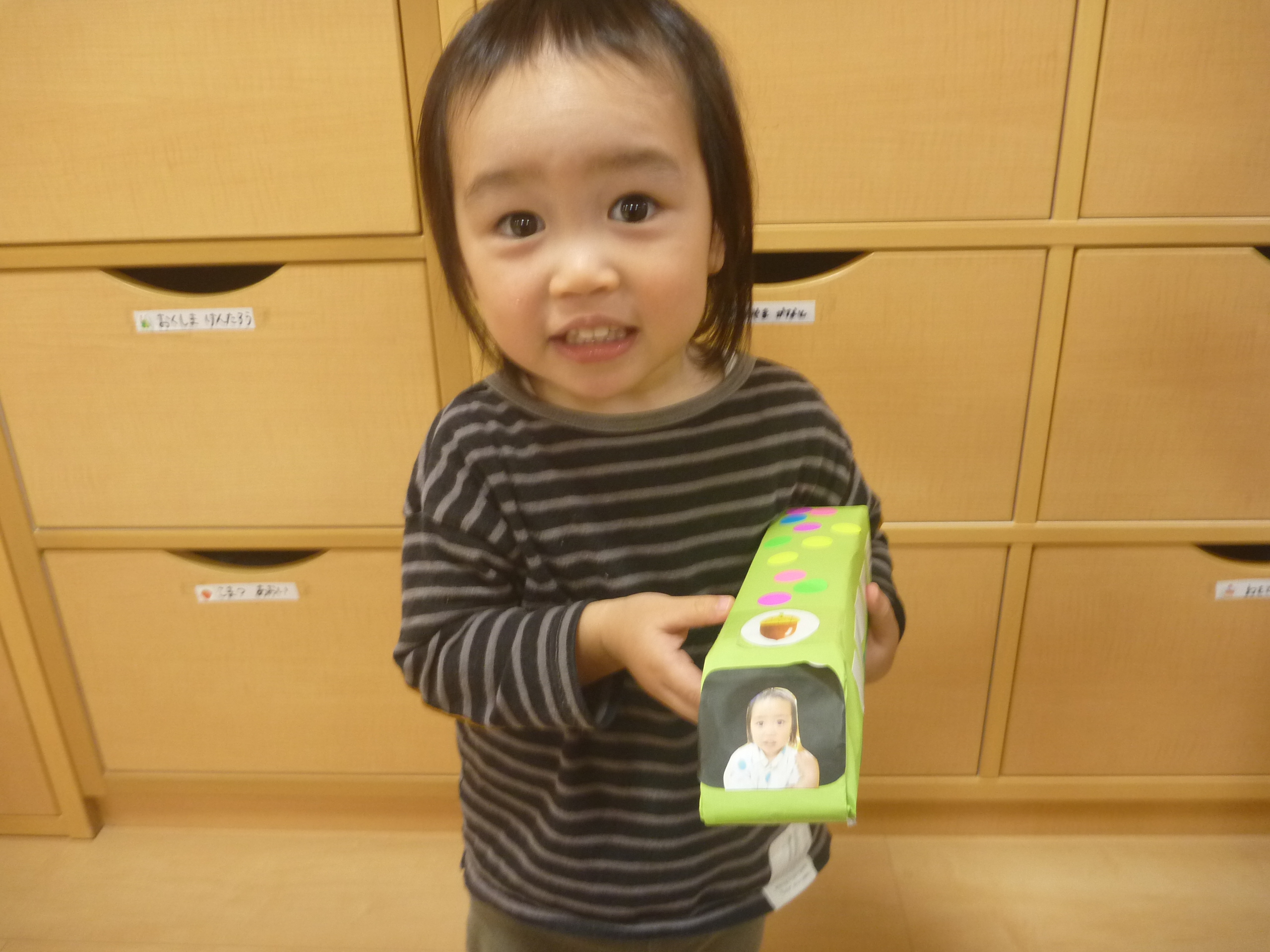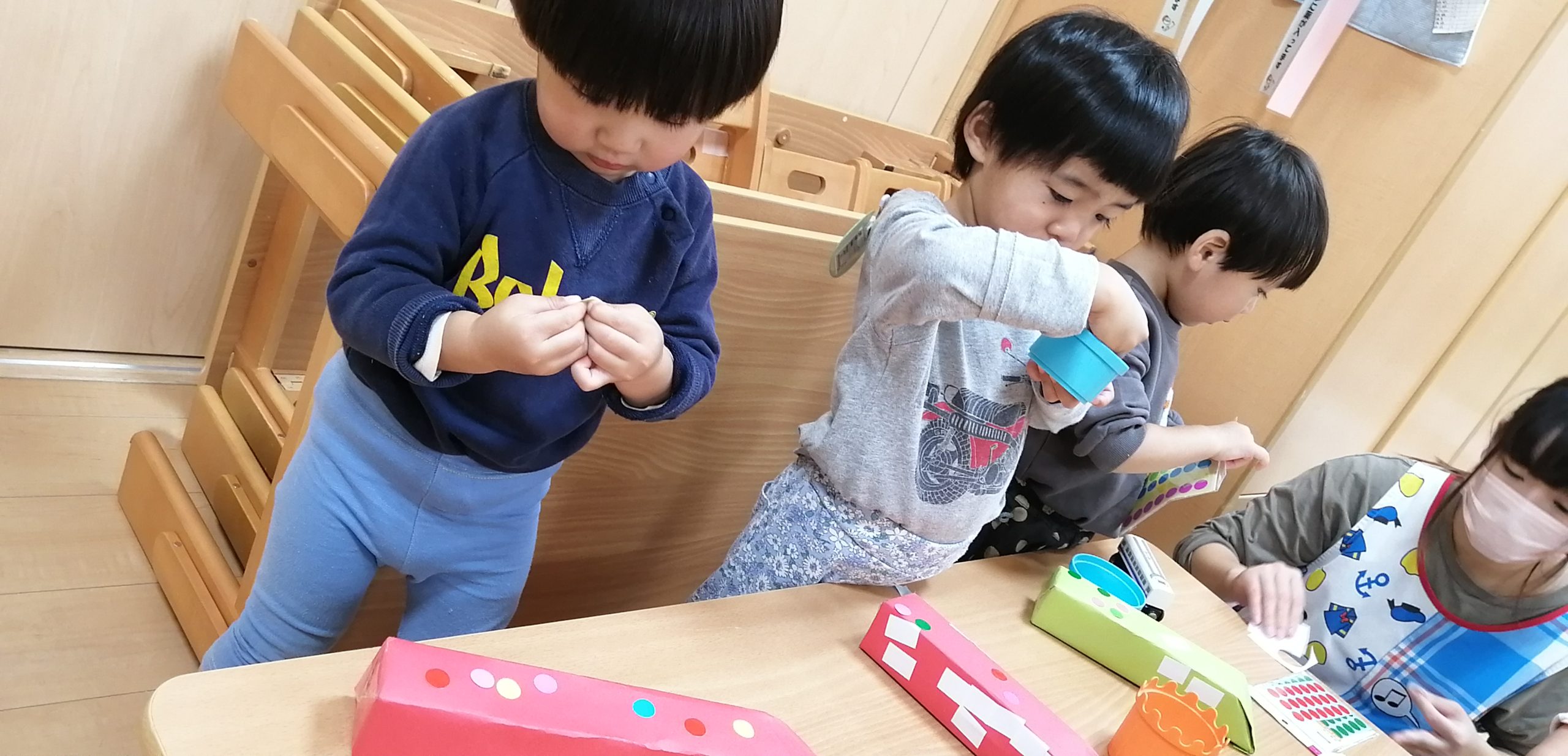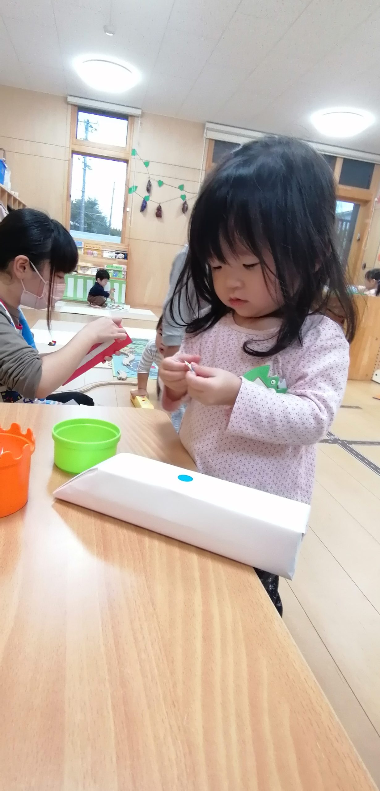 すみれ組(1歳児)さんで、何やら先生たちと一緒に製作をしていました。