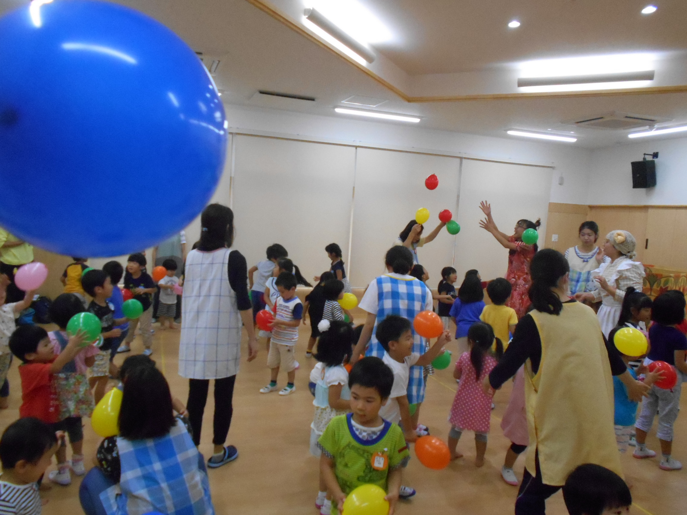 歌や体操、ふれあい遊びを楽しみ、最後は風船がたくさん出てきて、職員も一緒にいっぱい遊びました!!