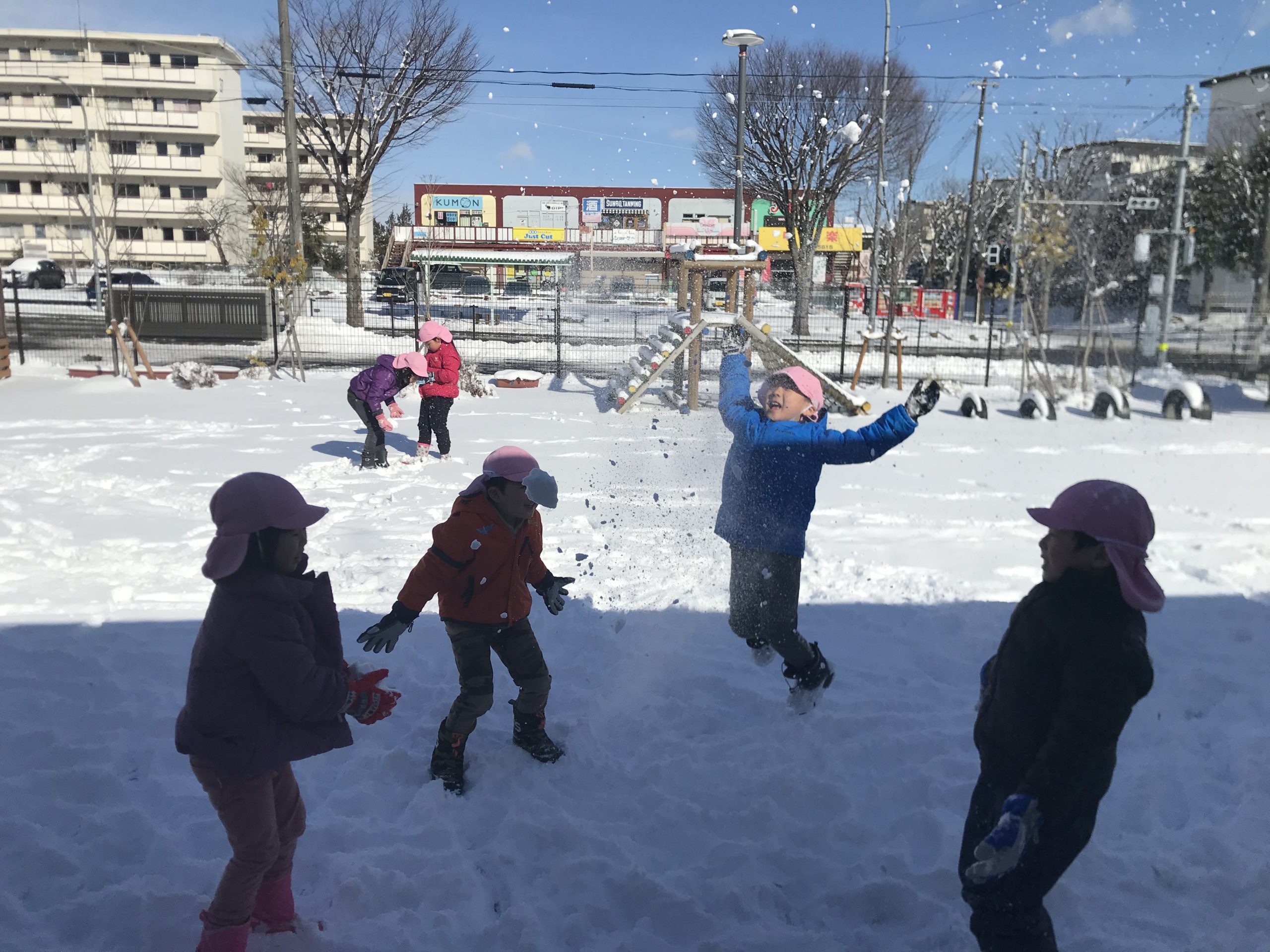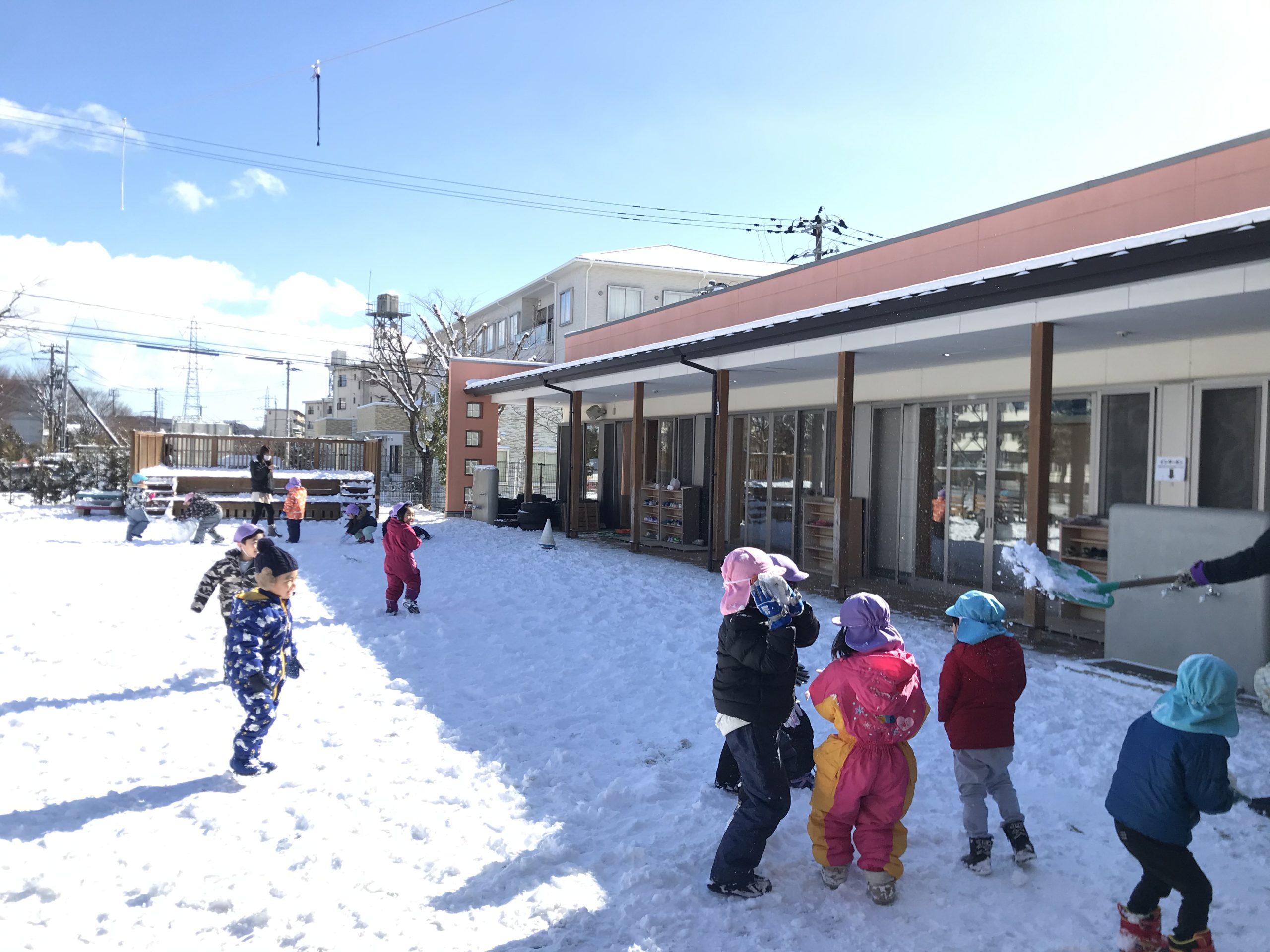 昨日から降り積もった雪⛄ 一面真っ白の園庭に駆け出し雪あそびを楽しみました!