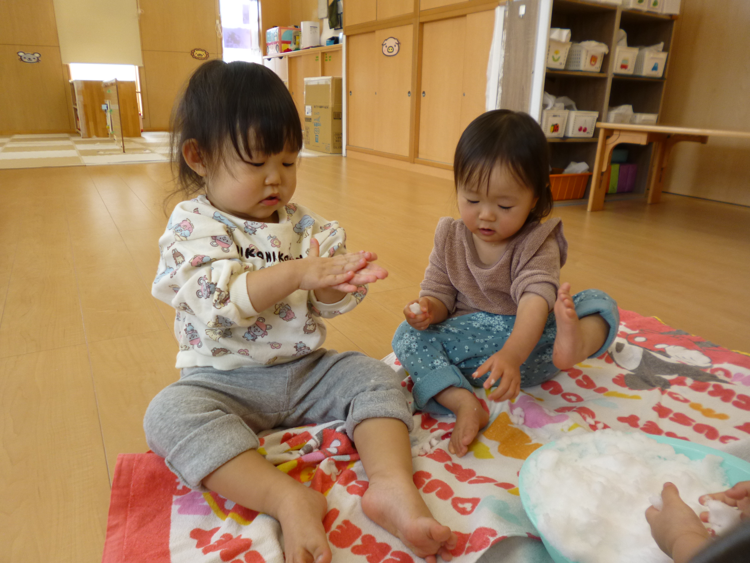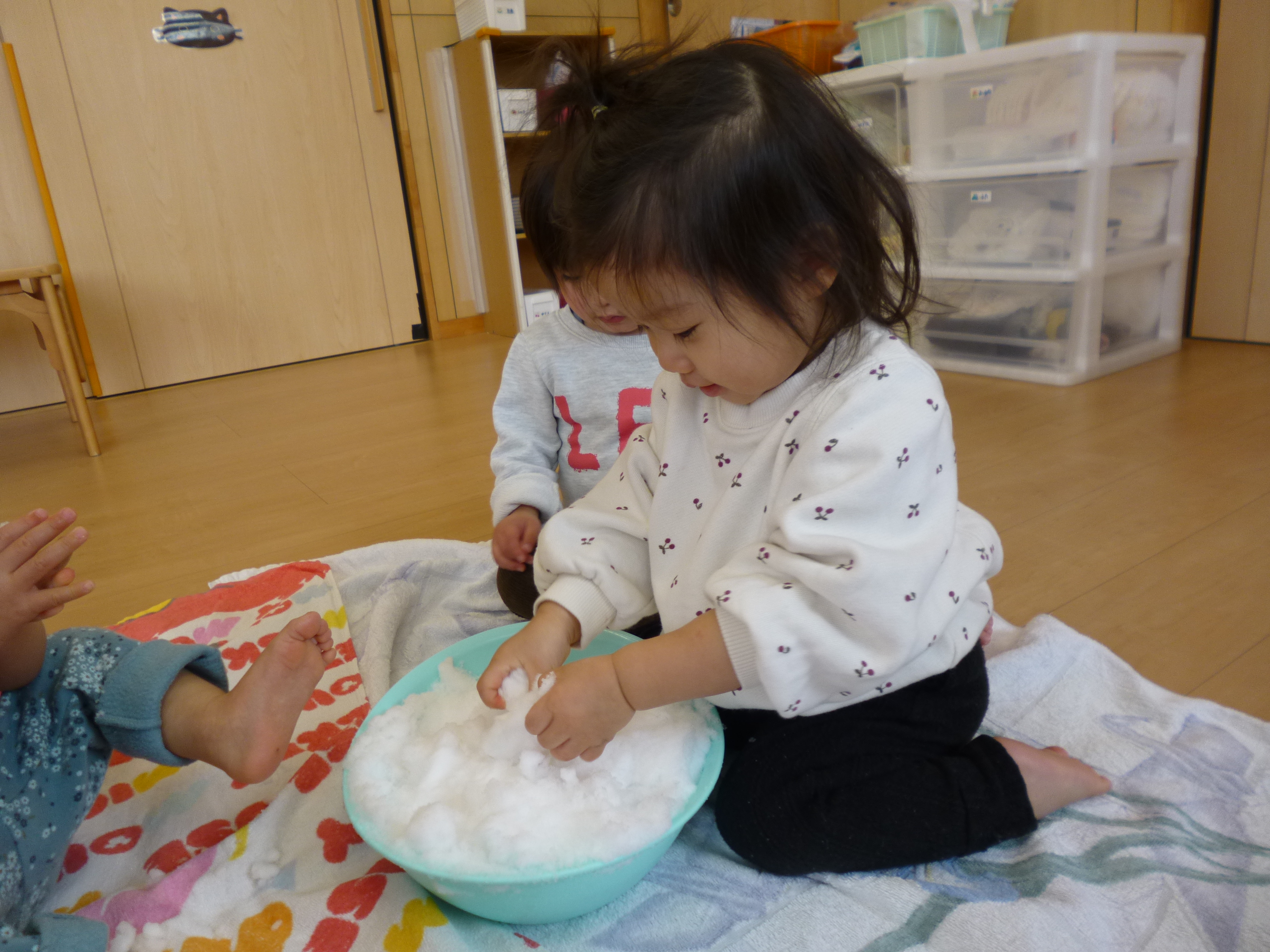 先生が0歳児れんげ組さんに雪を持ってきてくれました。 これが人生初めての雪あそび…。