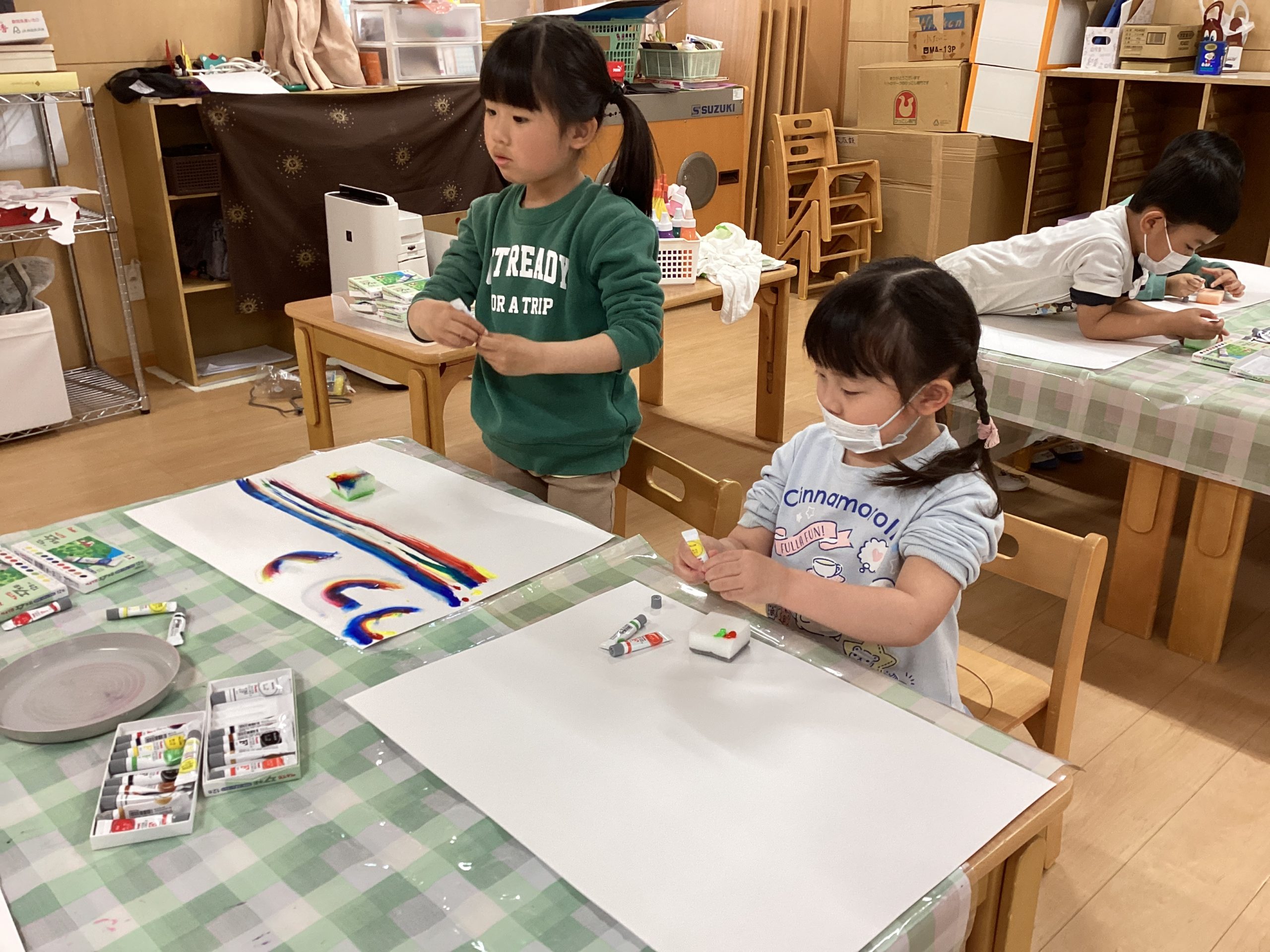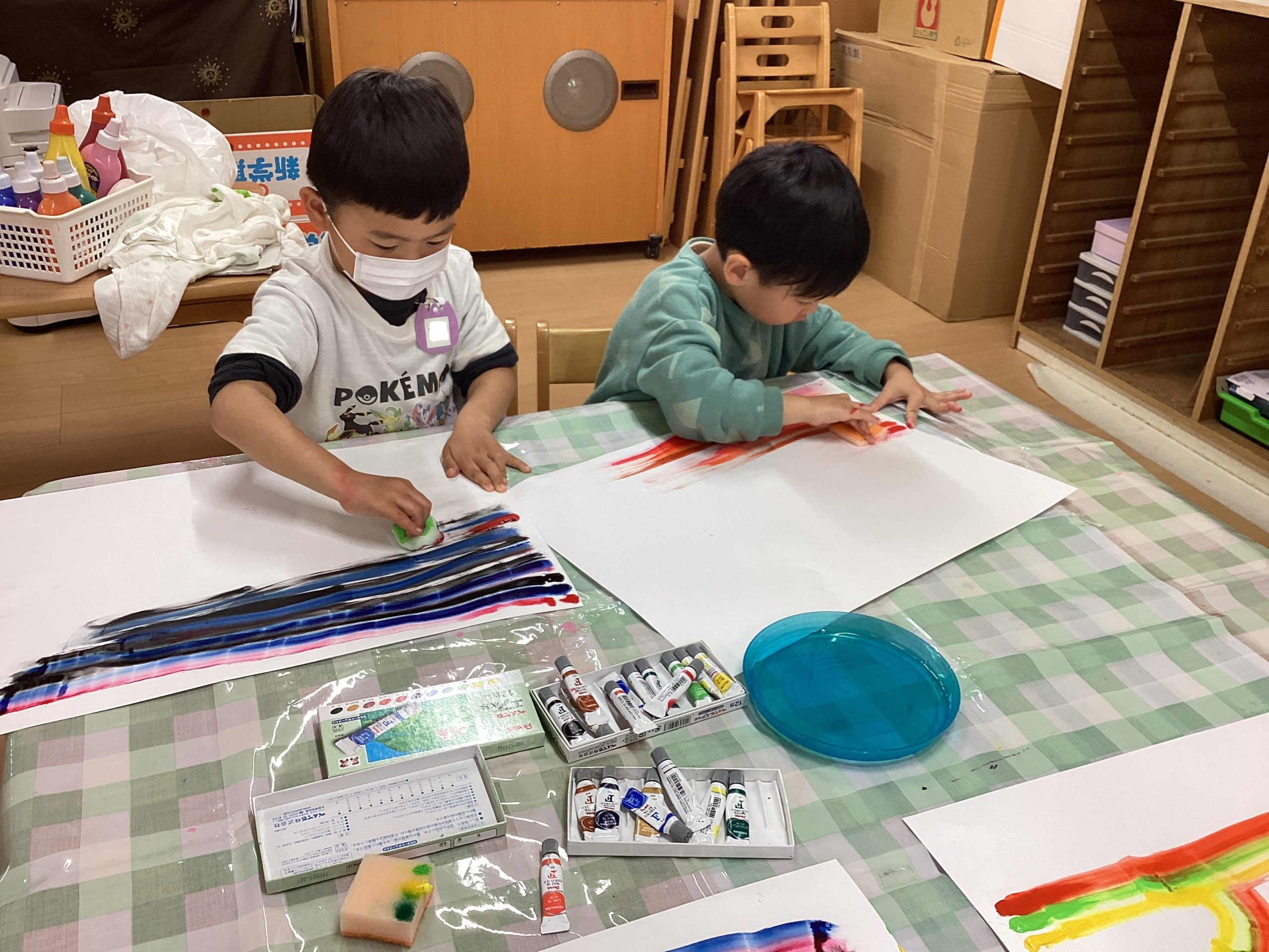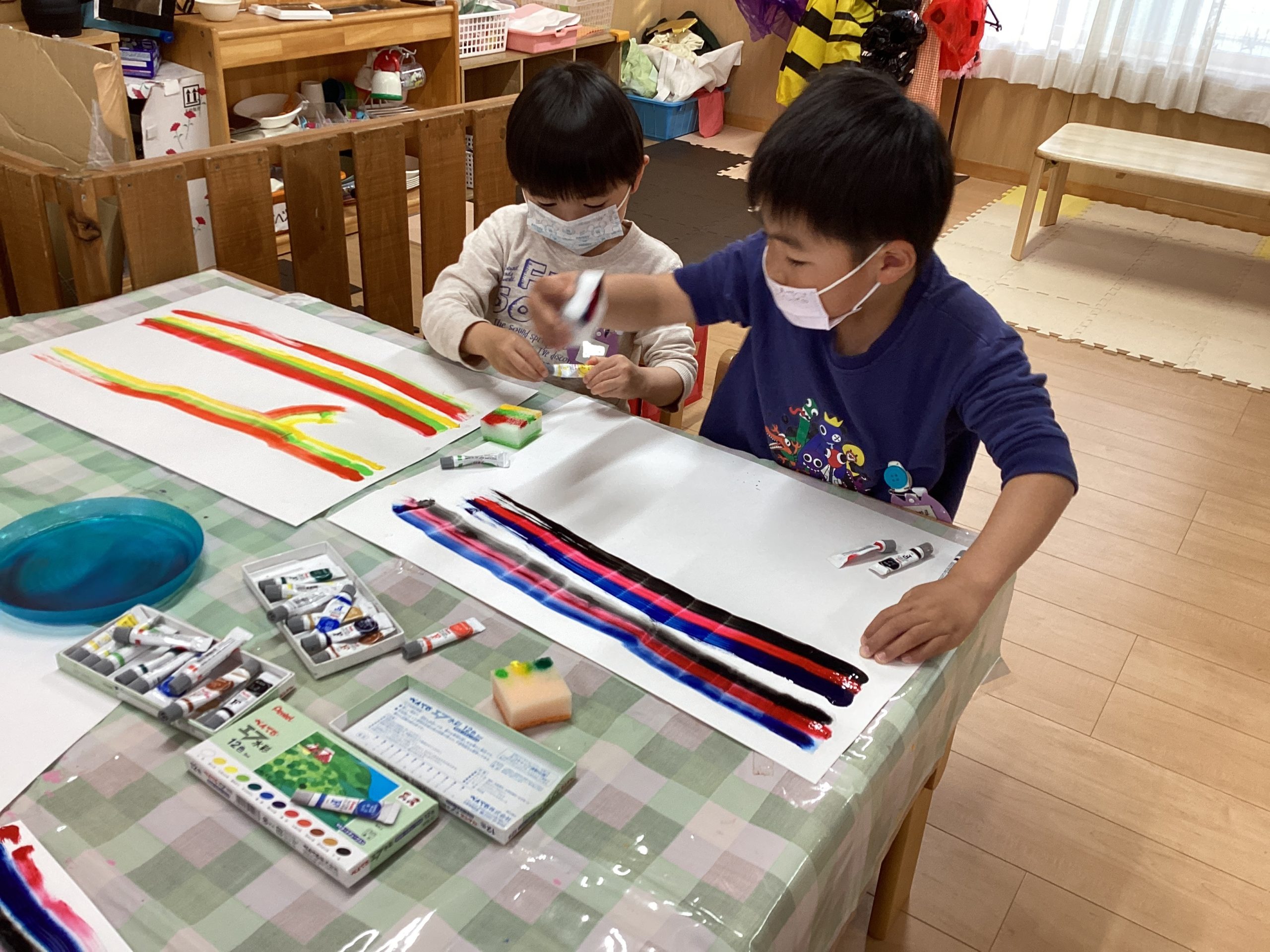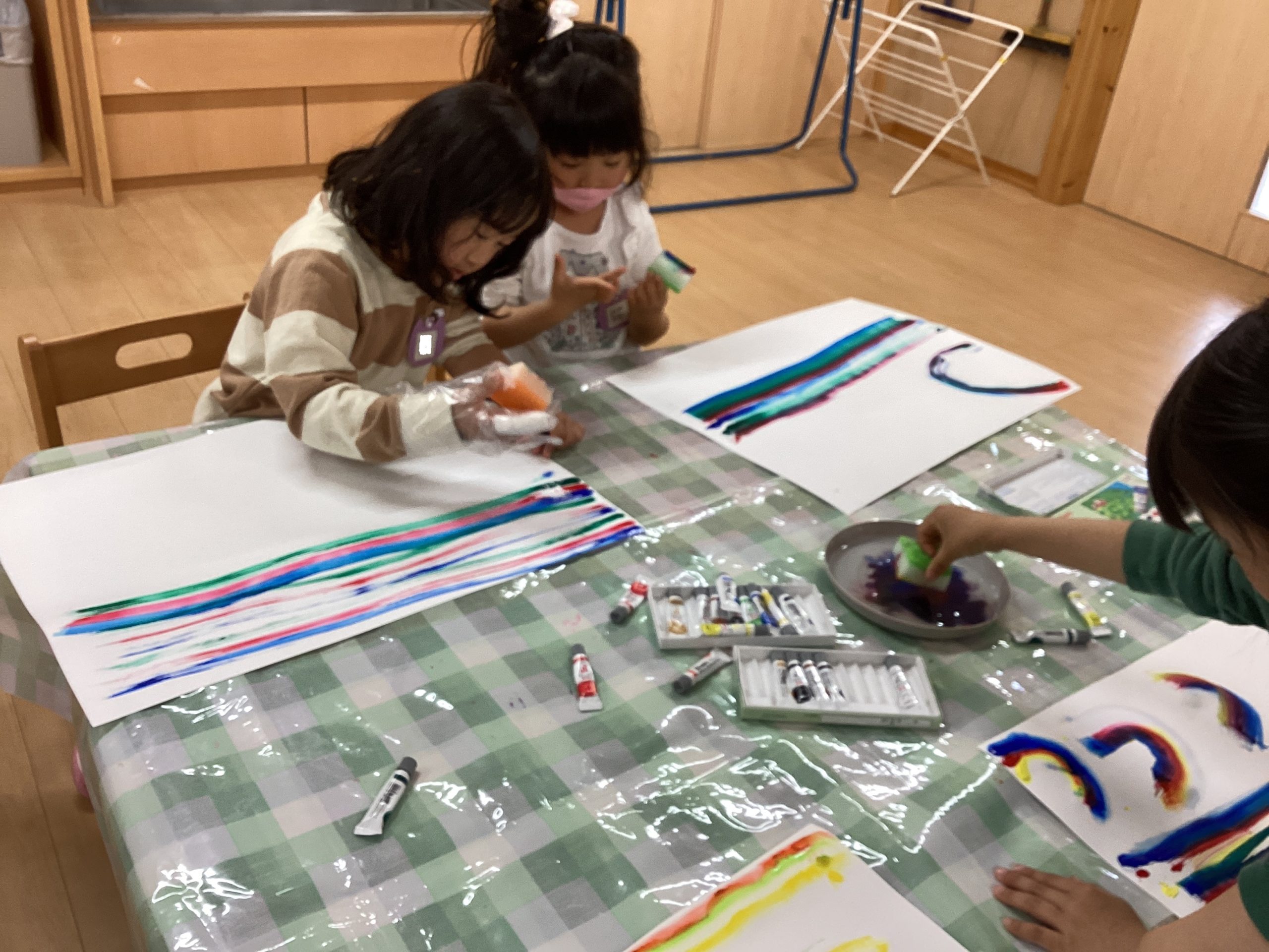 スポンジに絵の具を付けたものを滑らせ模様作り🌈