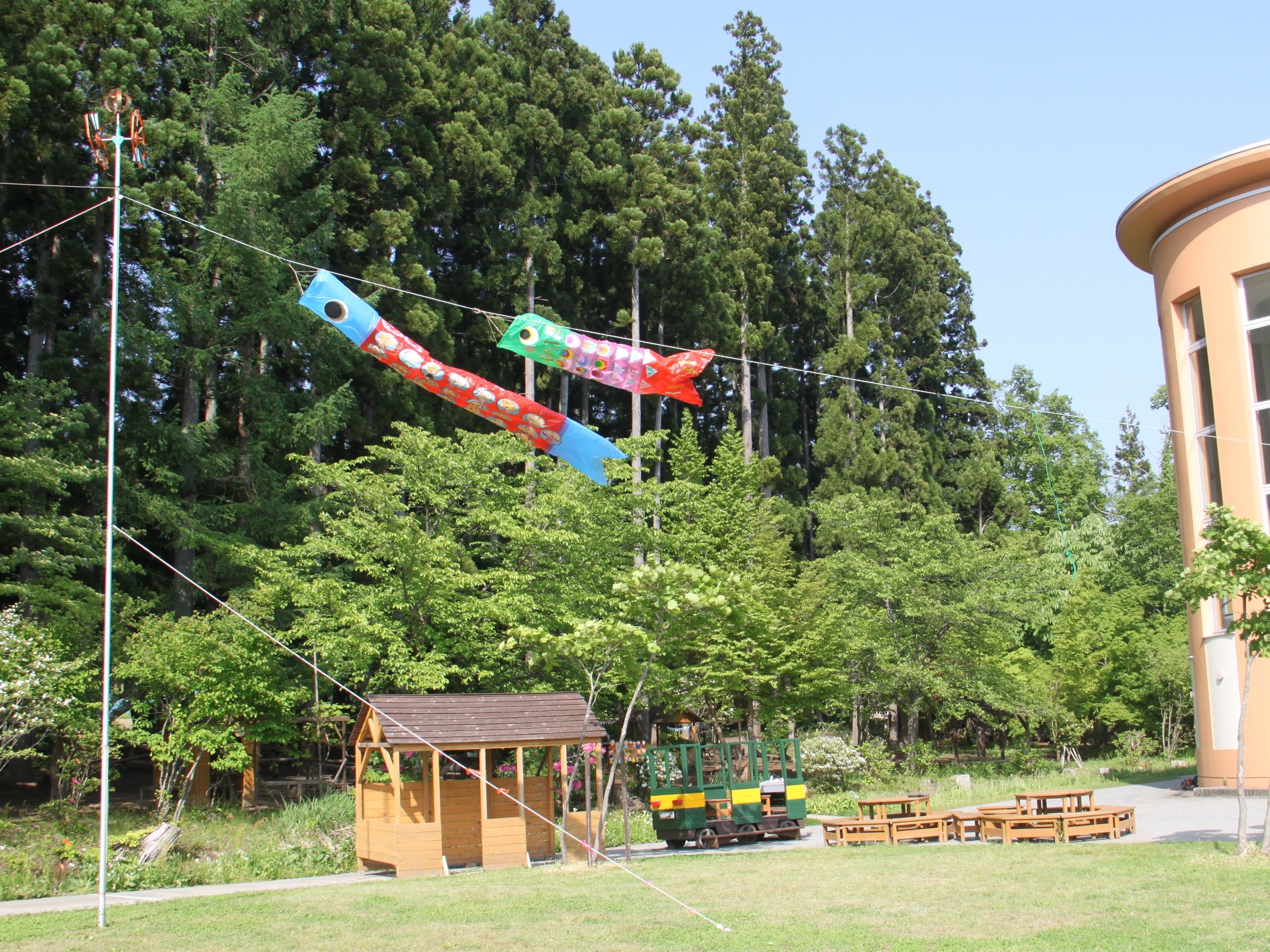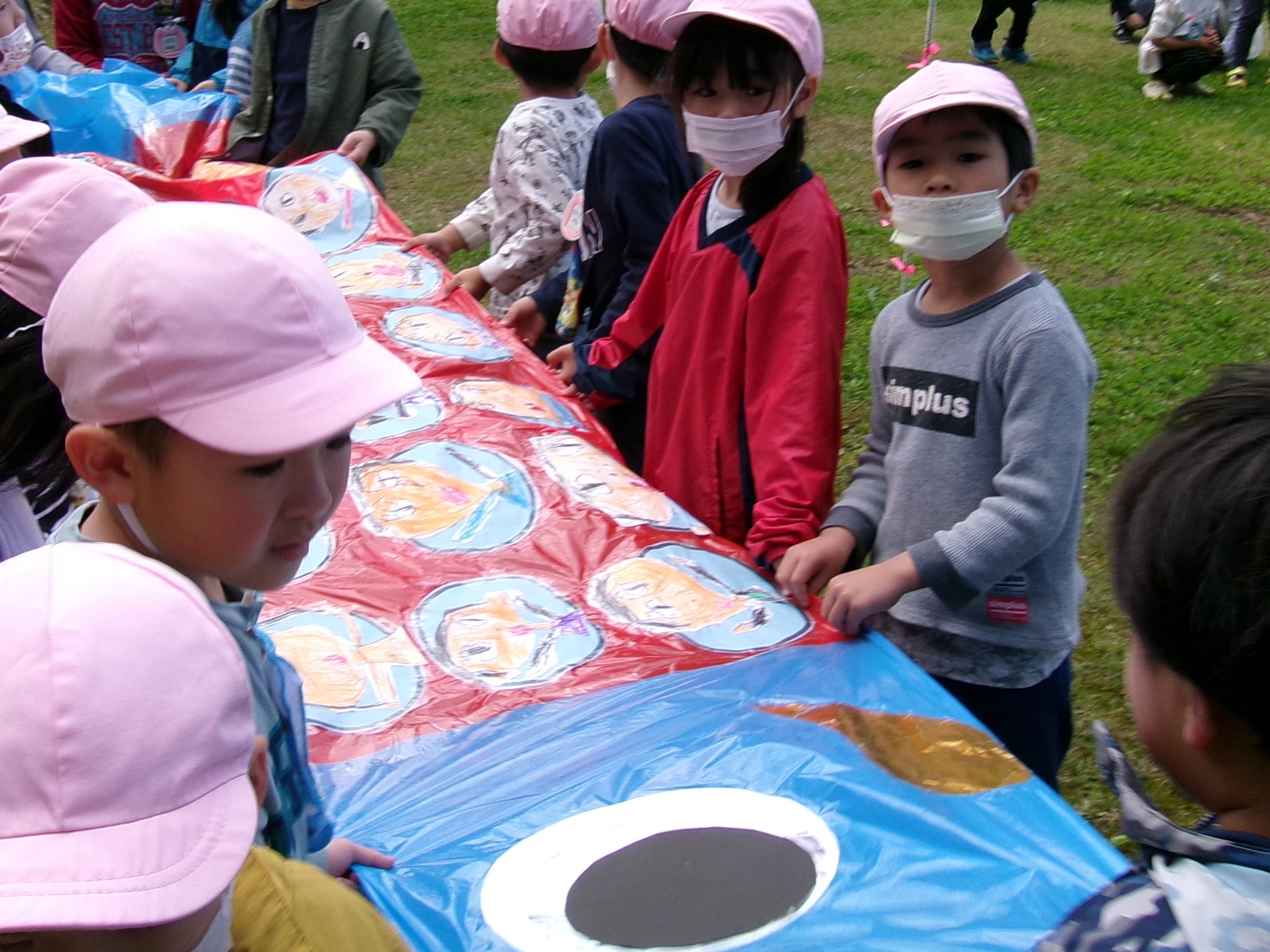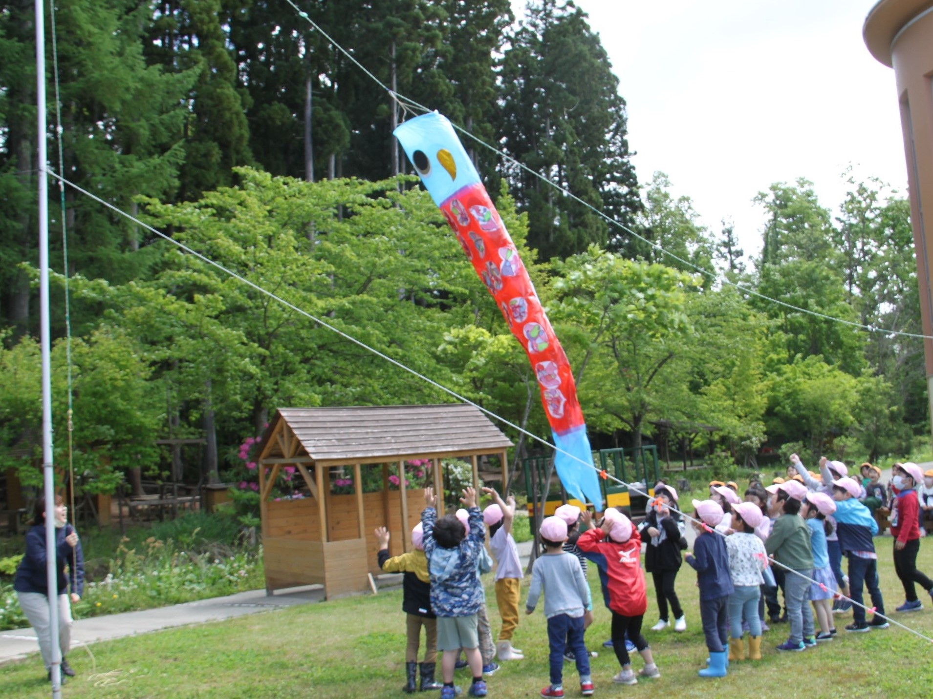 先生がうんとこしょってロープを引っ張ると…、こいのぼりは空高く泳ぎ始めました!