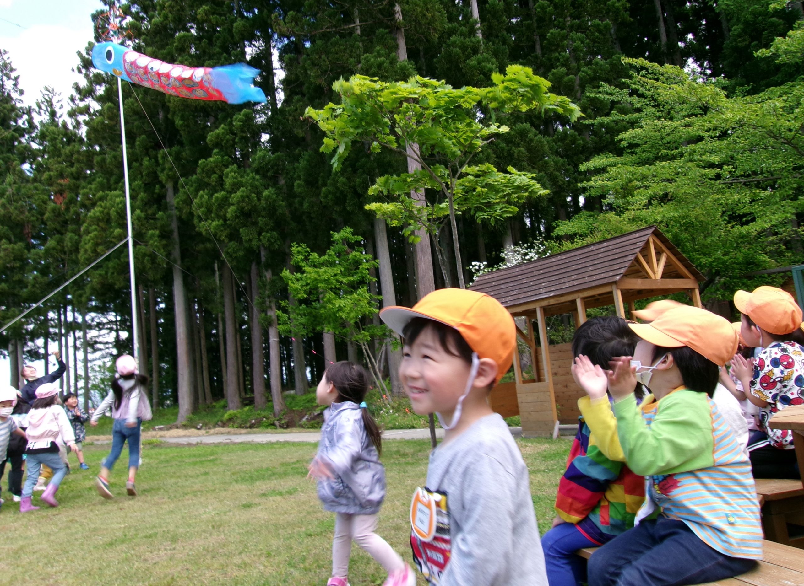 首が痛くなるほど空を見上げる子どもたち。風に乗って悠々と泳ぐ大きなこいのぼり、