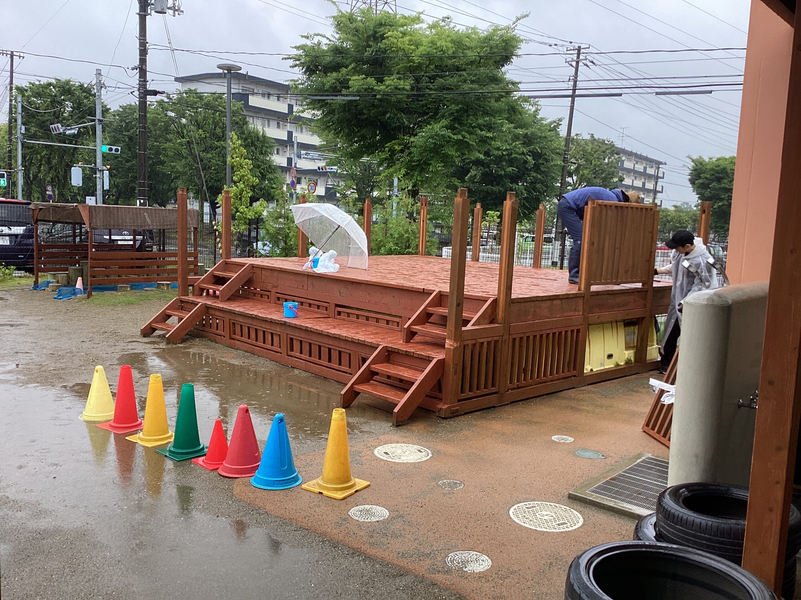大雨の中、岩持さんと姉妹園からお手伝いに来てくれた人たちで、何やら作業開始。