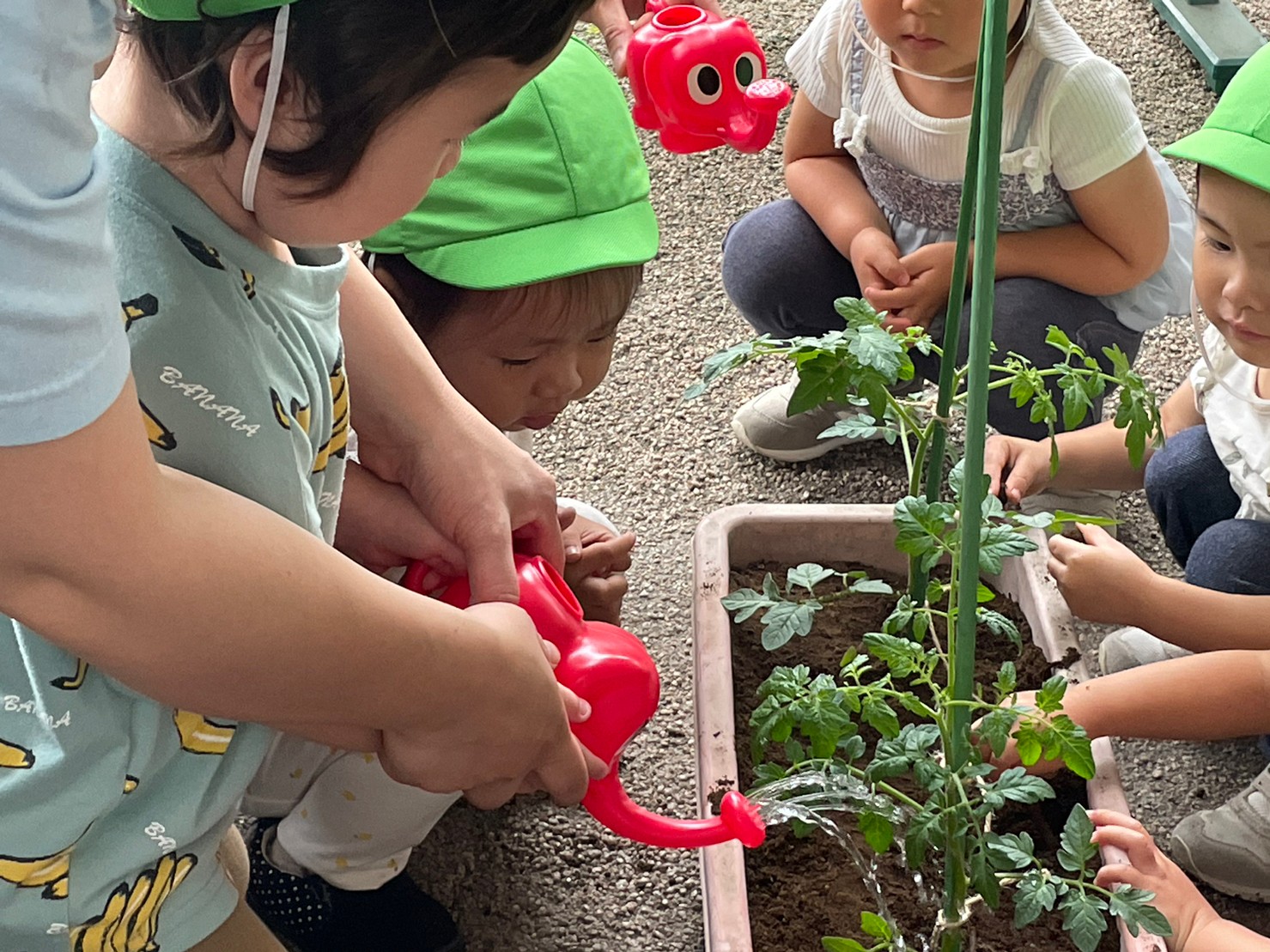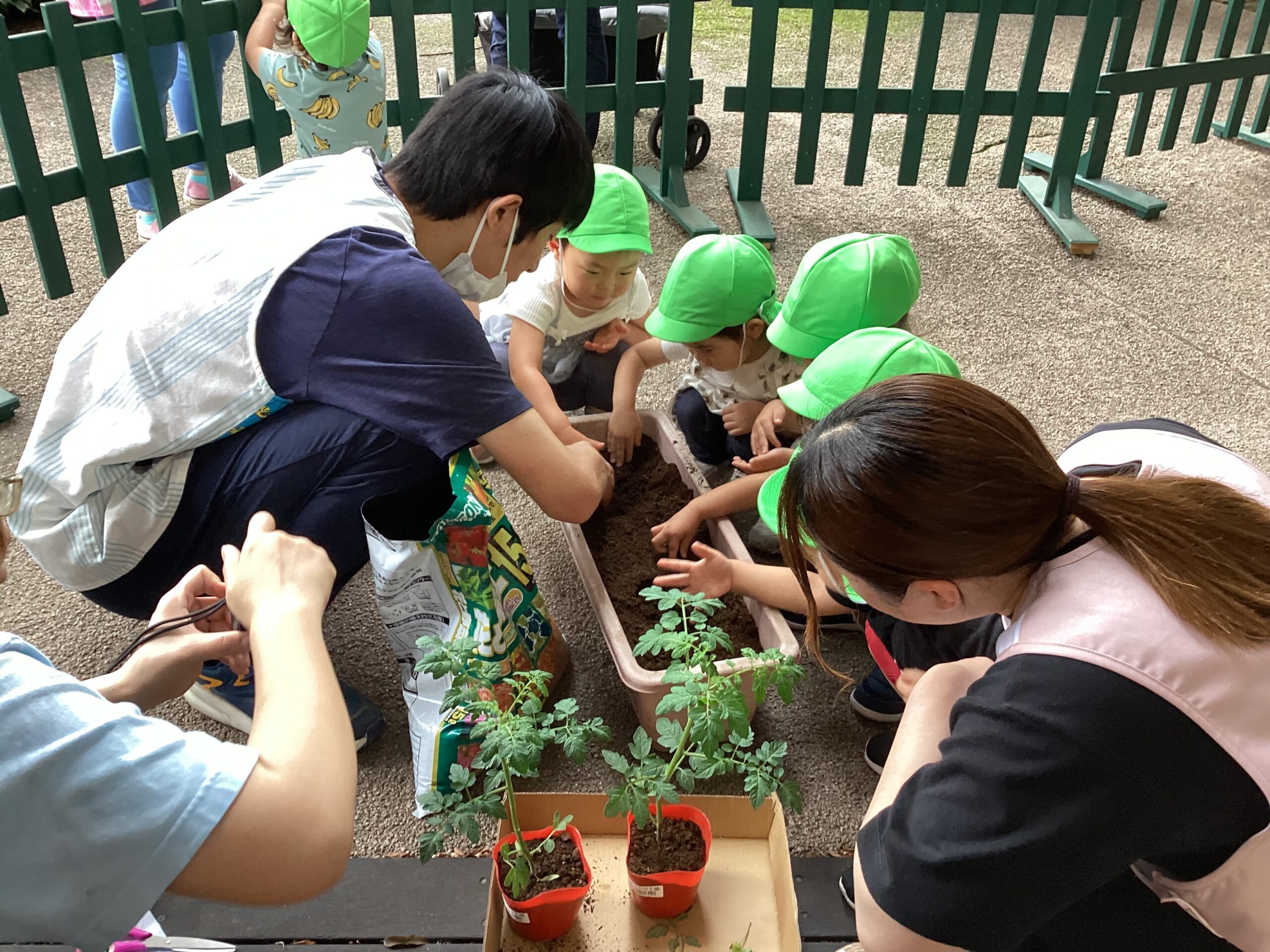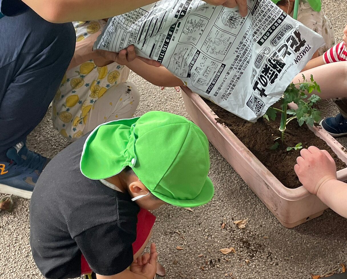 ひかり組(2歳児)さんが、トマトの苗を植えました。