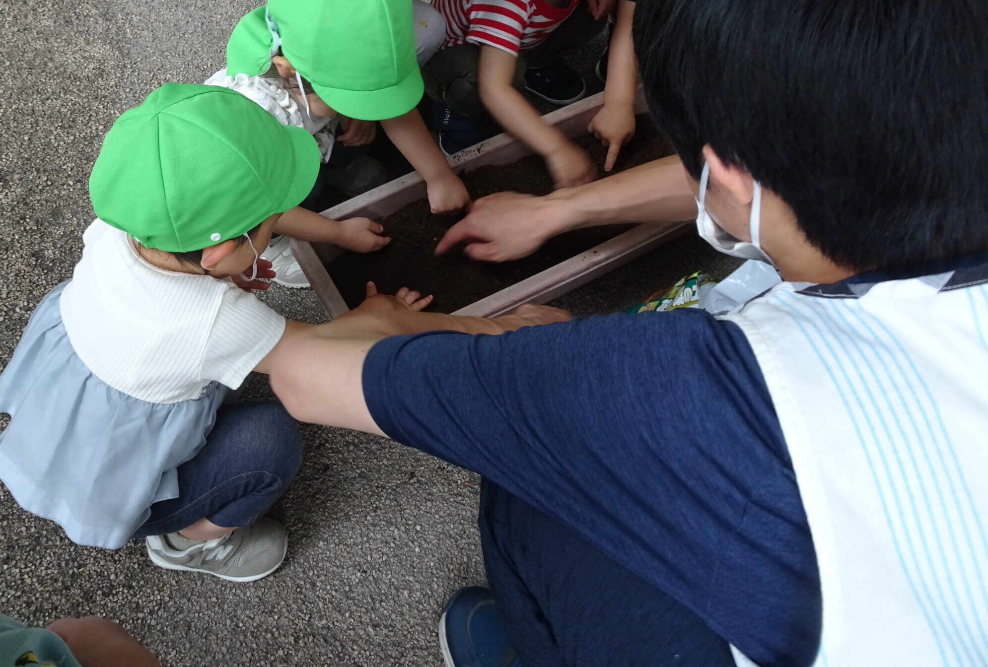 苗を入れたら、やさしく、やさしく、土のお布団をかけて~、