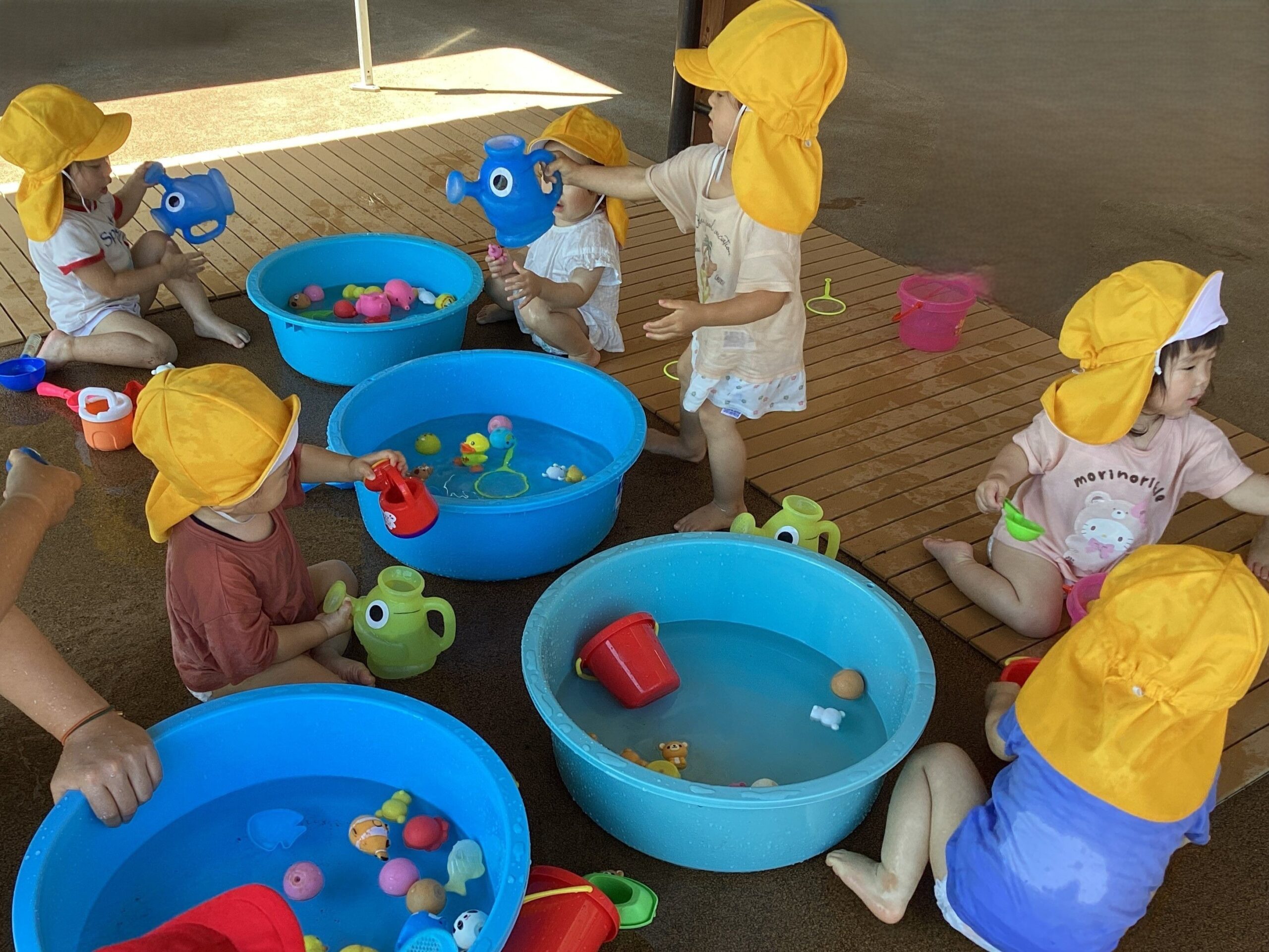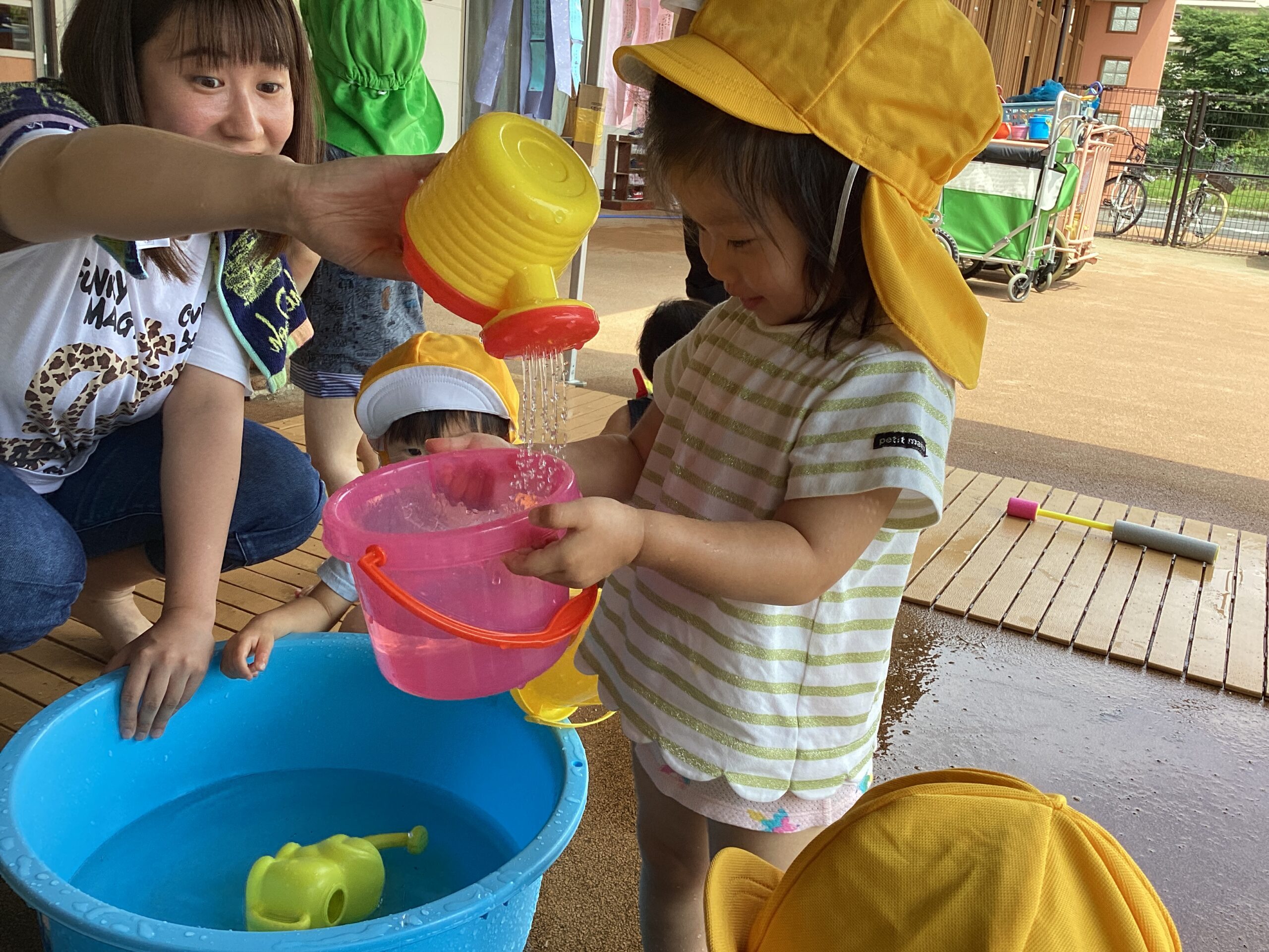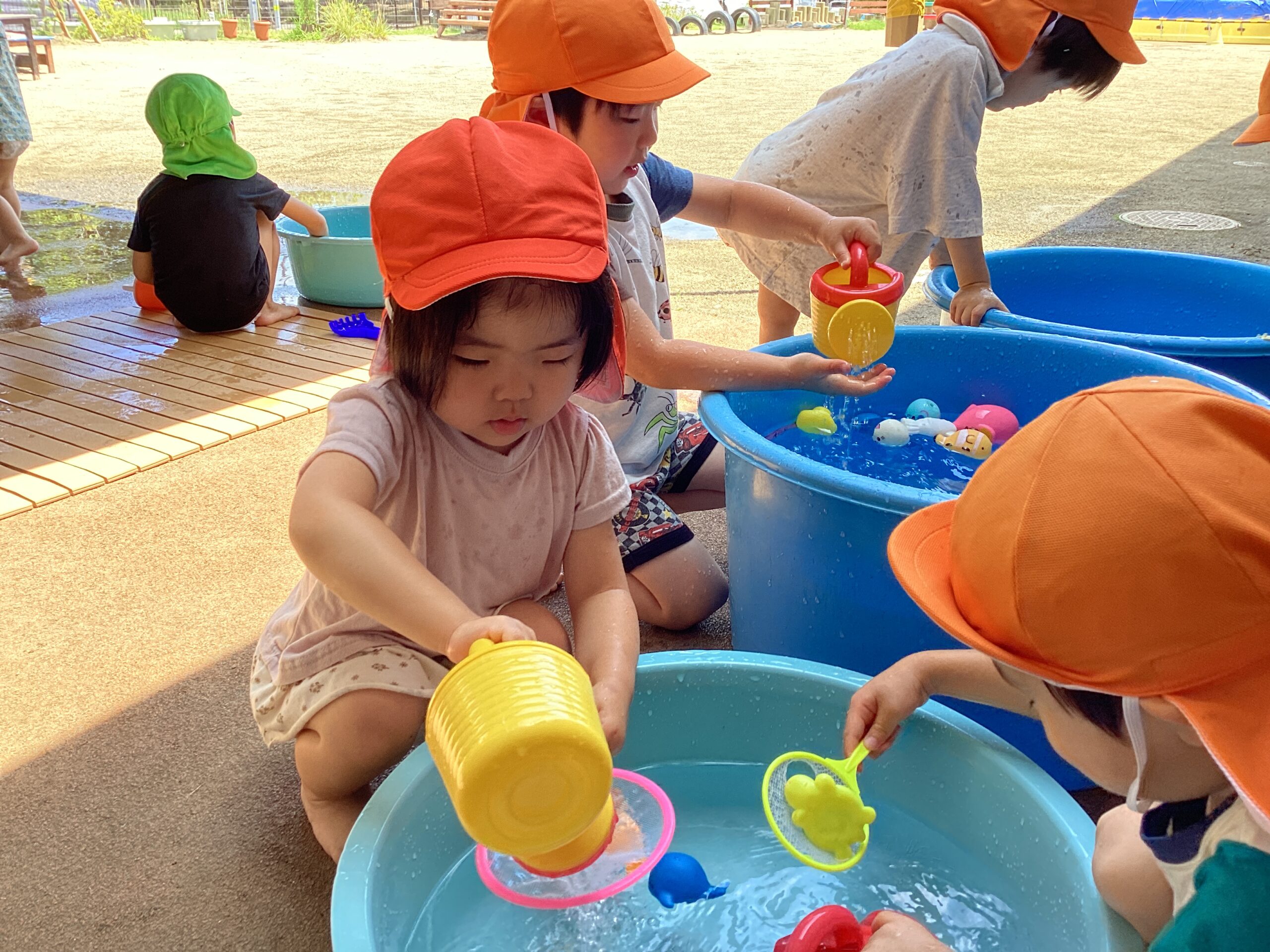 顔や身体に水がかかってもへっちゃらだよ!みんなで十分に水遊びを満喫しました~😊